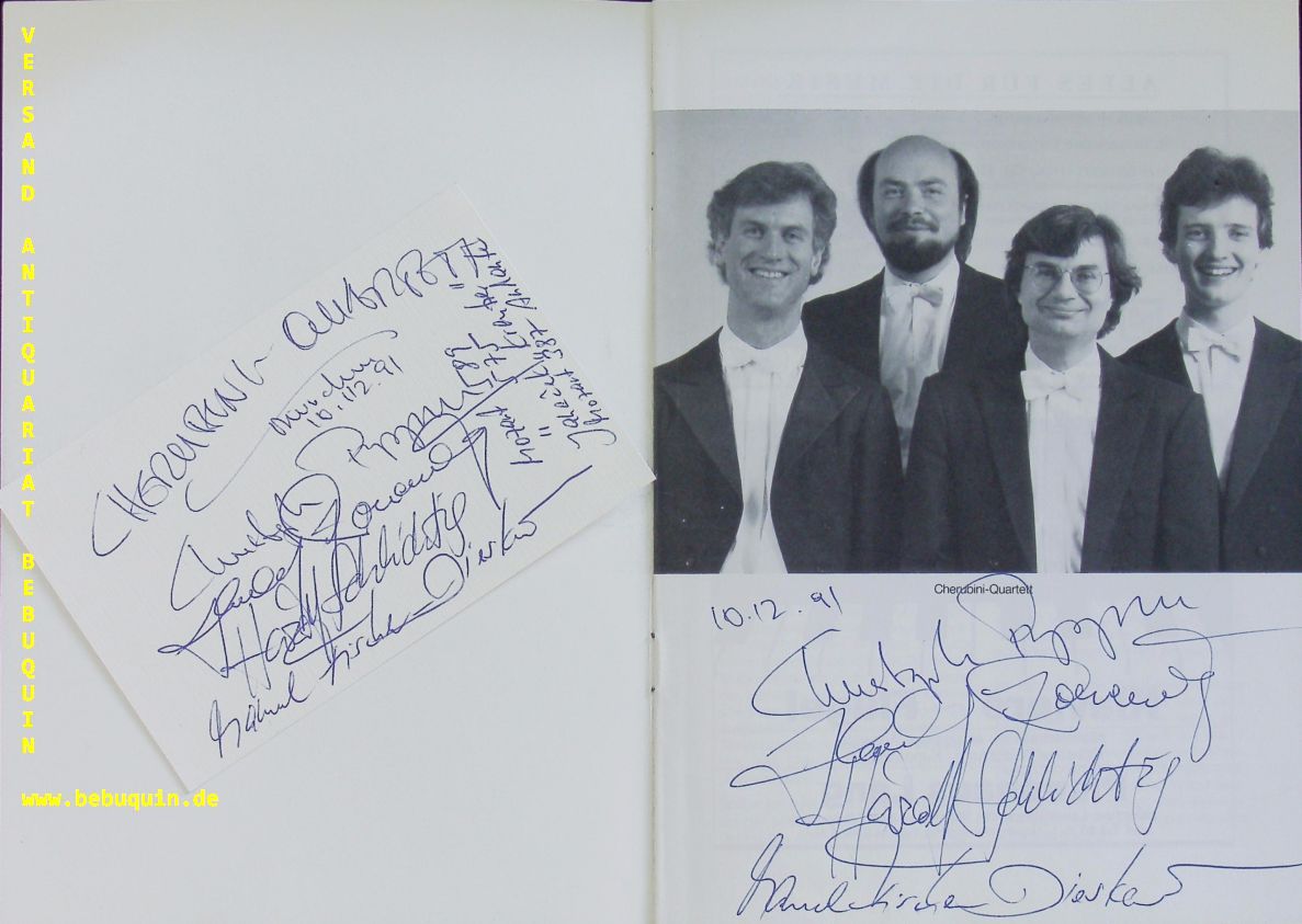 CHERUBINI QUARTETT.– POPPEN, Christoph + SCHÖNEWEG, Harald + SCHLICHTIG, Hariolf + FISCHER-DIESKAU, Manuel: Programmheft mit den vier eigenhändigen Signaturen am Portraitfoto. München (Herkulessaal), 10.12.1991. 12 S. mit Abb. OKart. dabei eine eigenhändig von den vier Musikern signierte und datierte Karteikarte. tadellos = Münchner Konzertdirektion Hörtnagel. Das Cherubini-Quartett war ein führendes deutsches Streichquartett aus Düsseldorf, das im Jahr 1978/79 gegründet wurde. (Wikipedia)