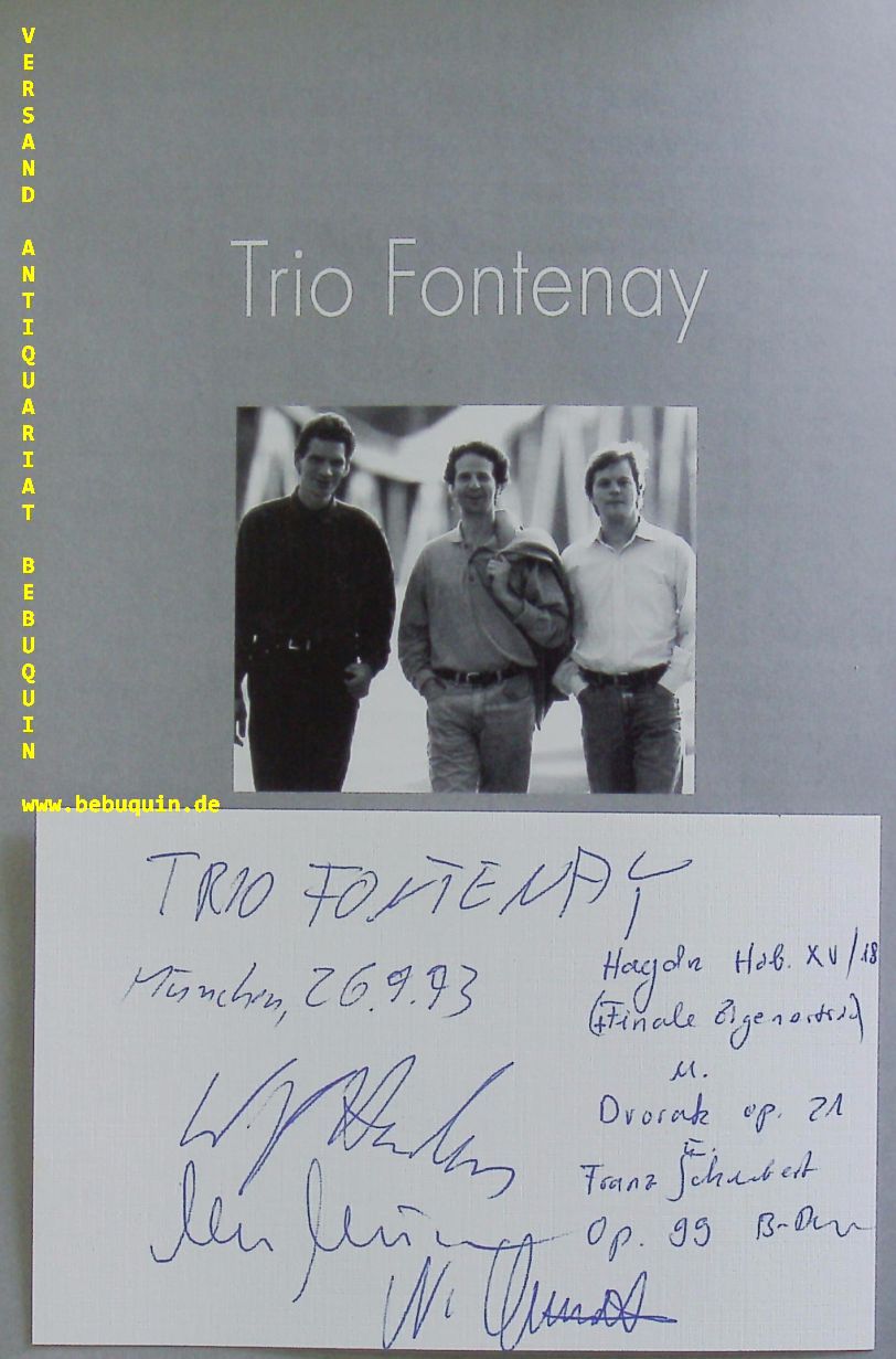 TRIO FONTENAY.– HARDEN, Wolf + MÜCKE, Michael + SCHMIDT, Niklas: eigenhändig von allen signierte und datierte Autogrammkarte. München (Herkulessaal), 26.9.1993. 8 x 12,5 cm. Karteikarte in Programmheft. 12 S. mit Abb. OKart. tadellos = Münchner Konzertdirektion Hörtnagel. Das Trio Fontenay war ein 1980 in Hamburg gegründetes und bis 2006 bestehendes Klaviertrio. In der Gründungsformation bestand es aus dem Pianisten Wolf Harden (* 1962), dem Geiger Michael Mücke (* 1962) und dem Cellisten Niklas Schmidt (* 1958). Nach dem Ausscheiden von Niklas Schmidt 1998 übernahm Jens Peter Maintz den Cellopart. (Wikipedia)
