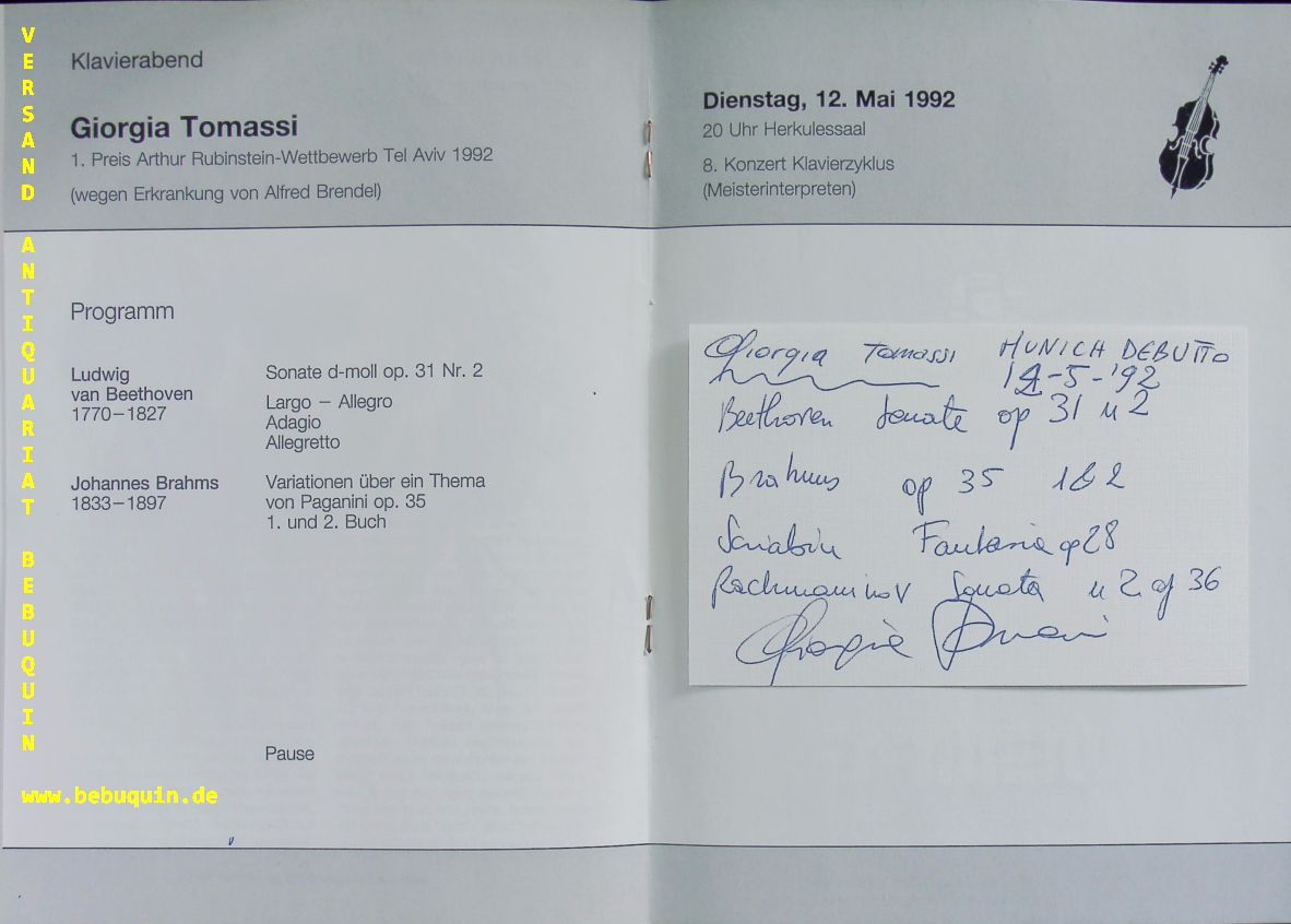 TOMASSI, Giorgia (Pianistin): eigenhändig signierte und datierte Autogrammkarte der Debutantin als Ersatz für Alfred Brendel. München (Herkulessaal), 12.5.1992. Karteikarte in Programmheft. 12 S. mit zahl. Abb. OKart. tadellos = Münchner Konzertdirektion Hörtnagel. Programmheft der Debutantin Giorgia Tomassi (* 1970 in Neapel) ist eine italienische Pianistin.