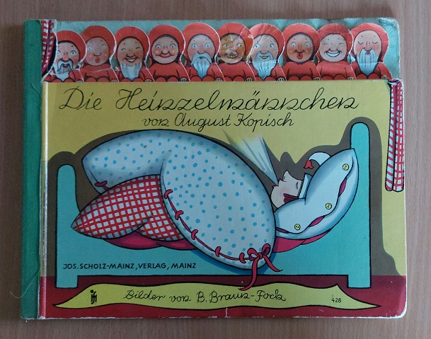 HEINZELMÄNNCHEN.– KOPISCH, August: Die Heinzelmännchen. Mainz (Jos. Scholz), (1948). Quer 4°. 10 Bl. mit 10 farb. Bildtafeln von Beatrice Braun-Fock, die jeweils mit einem am oberen Blattrand mit einem Heinzelmännchen gekrönt sind, die über das Deckelblatt hinausschauen. ill. OHLn. Die Heinzelmännchenköpfe mit teils reparierten kleineren Läsuren, aber immernoch gut erhalten. Sehr seltene Ausgabe mit der Verlagsnummer 428. Mück zeigt zu dieser Verlagsnummer unter 2340 ein völlig anderes Buch.