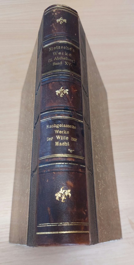 NIETZSCHE, Friedrich: Der Wille zur Macht. Versuch einer Umwerthung aller Werthe. (Studien und Fragmente). Nachgelassene Werke. Leipzig (Naumann), 1901. Gr. 8°. XXII, 541 S. OHLdr mit gold- und blindgeprägtem Rücken und marmorierten Deckeln. Rücken mit minimalen Druckstellen, insgesamt von sehr feiner wohl ungelesener Erhaltung. = Werke, 2. Abt. Bd. XV. seltene EA dieses umstrittenen Titels mit dem Vorwort von Elisabeth Foerster Nietzsche und den Anmerkungen von Peter Gast sowie Ernst und August Horneffer. Schönes Ex. der gesuchten Halblederausgabe. Knoche 3.