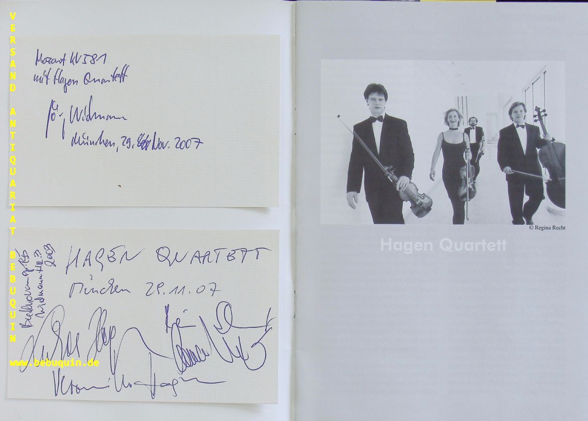 HAGEN QUARTETT.– WIDMANN, Jörg (Klarinette) + HAGEN, Lukas + Veronika + Clemens + SCHMIDT, Rainer: 2 eigenhändig signierte und datierte Autogrammkarten. München (Herkulessaal), 29.11.2007. 2 Karteikarten in Programmheft. 12 S. mit zahl. Abb. OKart. tadellos = Münchner Konzertdirektion Hörtnagel.