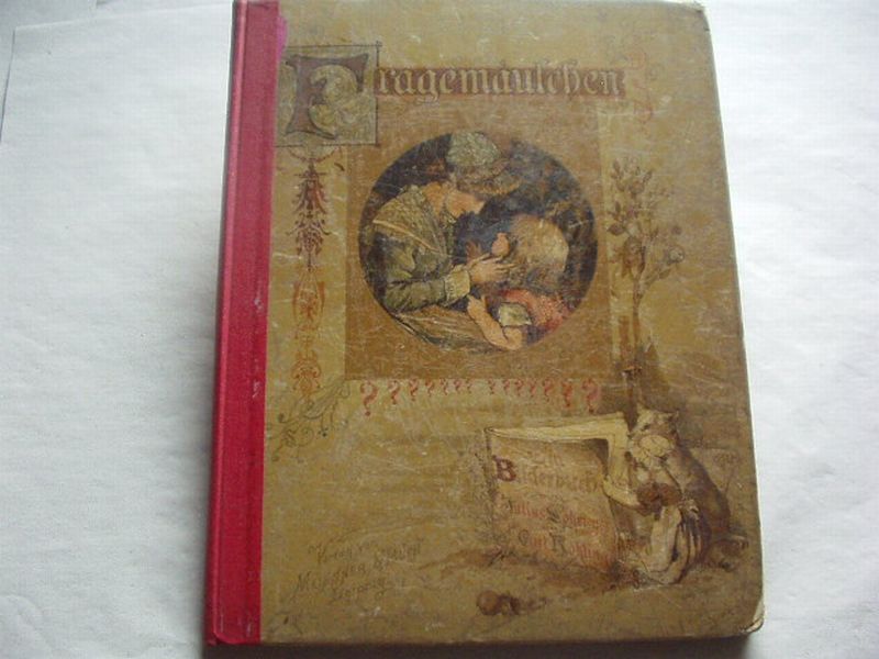 LOHMEYER, Julius: Fragemäulchen. Ein Bilderbuch. Leipzig (Meissner), (1885). 4°. 24 Bl mit 70 farblithographischen Illustrationen von Carl Röhling. farb. ill. OHLn. Einband etwas berieben und fleckig, innen kaum fingerspurig. EA Wegehaupt 2032 . Erläutert in Frage und Antwort dem Kinde seine alltägliche Umwelt. Die Bilder zeigen in sehr lebendiger Darstelung ein detailgetreues Bild der Zeit, inclusive einige ganzseitige Darstellungen von Berufen wie Schuhmacher, Bäcker, Holzfäller, Gärtner, Schmied etc.