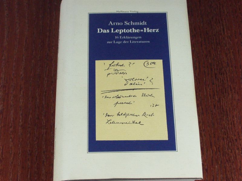 SCHMIDT, Arno: Das Leptothe-Herz. 16 Erklärungen zur Lage der Literaturen. Zürich (Haffmann), 1987. kl. 8°. 211 S. OPb mit OUmschl. EA (d.i. 1.– 8. Tsd.)