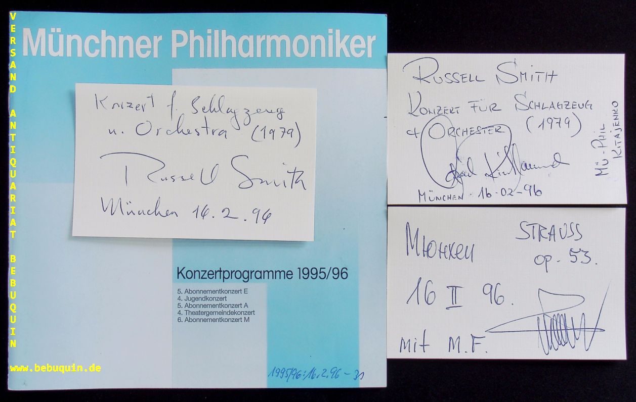 SMITH, Russell (Komponist) + RIEDHAMMER, Arnold F. (Schlagzeuger) + KITAJENKO, Dmitriij (Dirigent): 3 eigenhändig datierte und signierte Autogrammkarten. München (Philharmonie), 12.2.1996. 8 x 12,5 cm. 3 Karteikarten in Programmheft. 16 S. mit zahlr. Abb. 2 Eintrittskarten anbei. Riedhammer Autogramm leicht wischspurig, sonst tadellos. = Münchner Philharmoniker. Der am 23.4.1927 in Tuscaloosa geborene Komponst Russell Smith war zugegen. Arnold F. Riedhammer (* 1947 in Somerville (New Jersey)) ist ein deutsch-amerikanischer Musiker, Komponist und Arrangeur. Er ist Solo-Schlagzeuger der Münchner Philharmoniker und der Gruppe Blechschaden. Dmitri Georgijewitsch Kitajenko (* 18. August 1940 in Leningrad (heute Sankt Petersburg), Sowjetunion) ist ein russischer Dirigent. (Wikipedia)