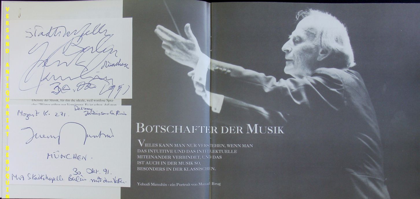 MENUHIN, Yehudi (Dirigent) + MENUHIN, Jeremy (Pianist): 2 eigenhändig signierte und datierte Autogrammkarte. München (Philharmonie), 30.10.1991. 8 x 12,5 cm. 2 Karteikarten in Programmheft. 16 S. mit zahlr. Abb. OKart. Anbei 1 Eintrittskarte. tadellos = Winderstein Konzerte. Yehudi Menuhin (* 22. April 1916 in New York; † 12. März 1999 in Berlin) war ein von Geburt US-amerikanischer, ab 1970 auch schweizerischer und ab 1985 auch britischer Violinist, Bratschist und Dirigent. Er zählt zu den bedeutendsten Geigenvirtuosen des 20. Jahrhunderts. Neben seiner Tätigkeit als Solist und Dirigent gründete Menuhin ab 1957 Institutionen und Projekte in verschiedenen Ländern zur Förderung der Musik. Jeremy Louis Eugene Menuhin (born 2 November 1951) is a composer and pianist and the son of violinist Yehudi Menuhin. (Wikipedia)