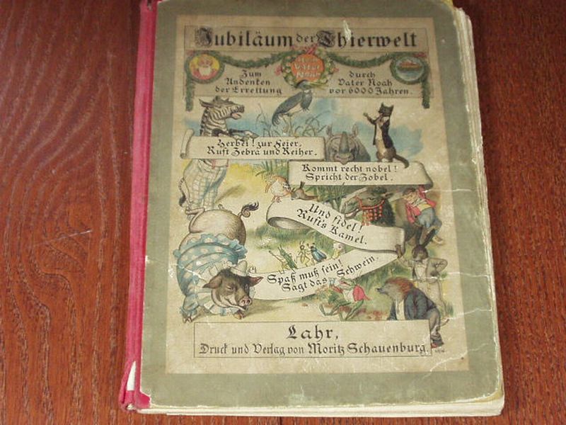 SIEBEL, R.: Jubiläum der Tierwelt. Zum Andenken der Errettung durch Vater Noah vor 6000 Jahren. Lahr (Schauenburg), (1895). Gr. 8°. Titelblatt + 16 nn Blatt mit feinen chromolithographischen Bildern von W. A. Wellner. farb. ill. OHLn. teils fingerspurig, eine Tafel mit hinterlegtem Einriss, sonst akzeptabel. Sehr seltenes Kinderbuch mit humorigen Versen. Ries 969. Wilhelm Anton Wellner, 1859 in Königsberg geboren war Mitarbeiter der Lustigen Blätter und lebte in Berlin.