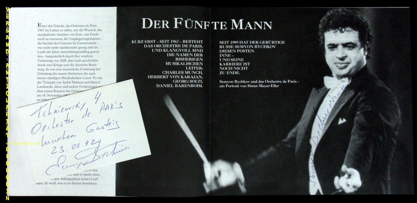 BYCHKOV, Semyon (Dirigent): eigenhändig signierte und datierte Autogrammkarte. Mit dem Orchestre de Paris. München (Philharmonie), 23.3.1992. 8 x 12,5 cm. Karteikarten in Programmheft. darin auf der Titelseite und am Portrait zusätzlich persönlich signiert. 16 S. mit zahlr. Abb. OKart. tadellos = Winderstein Konzerte. Semjon Majewitsch Bytschkow (* 30. November 1952 in Leningrad, Russische SFSR, Sowjetunion) ist ein Dirigent sowjetischer Herkunft. (Wikipedia)