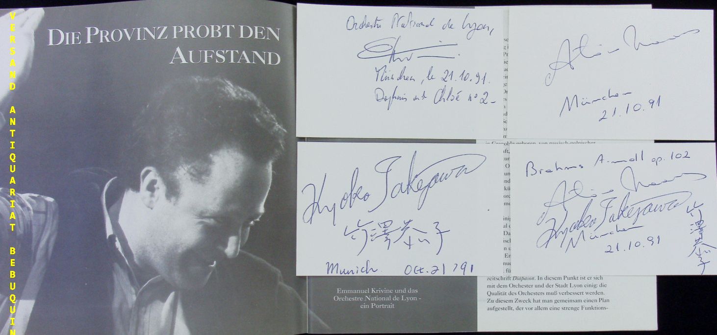 KRIVINE, Emmanuel (Dirigent) + TAKEZAWA, Kyoko (Violinistin) + MENESES, Antonio (Cellist): 4 eigenhändig signierte und datierte Autogrammkarte. München (Philharmonie), 21.10.1991. 8 x 12,5 cm. 4 Karteikarte in Programmheft. Jeweils einzeln und die Solisten zusammen. 16 S. mit zahlr. Abb. OKart. tadellos = Winderstein Konzerte. Emmanuel Krivine (* 7. Mai 1947 in Grenoble) ist ein französischer Dirigent und Violinist. Antônio Meneses Neto (* 23. August 1957 in Recife, Pernambuco) ist ein brasilianischer Cellist. Er gilt als prominentester Schüler von Antonio Janigro, dessen langjähriger Assistent er an der Musikhochschule Stuttgart war. Als einziger Cellist gewann er sowohl den ARD-Wettbewerb als auch den Tschaikowsky-Wettbewerb. Er war Professor an der Musik-Akademie der Stadt Basel und Cellist des weltberühmten Beaux Arts Trios. (Wikipedia)