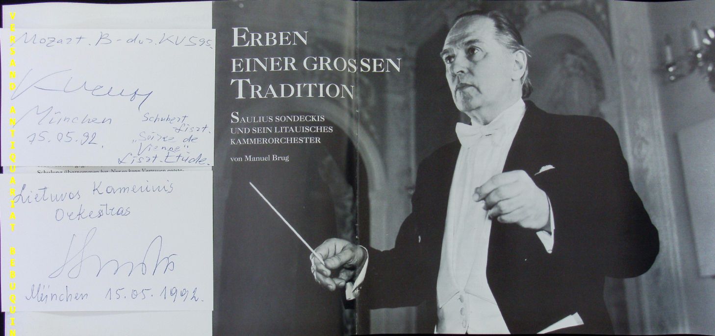 SONDECKIS, Saulius (Dirigent) + KISSIN, Jewgenij (Pianist): 2 eigenhändig signierte und datierte Autogrammkarte. München (Philharmonie), 15.5.1992. 8 x 12,5 cm. 2 Karteikarten in Programmheft. 16 S. mit zahlr. Abb. OKart. leicht gewellt. = Winderstein Konzerte. Saulius Sondeckis (* 11. Oktober 1928 in Šiauliai; † 3. Februar 2016) war ein litauischer Dirigent und Professor. Jewgeni Igorewitsch Kissin (* 10. Oktober 1971 in Moskau, Sowjetunion) ist ein russischer Pianist und Komponist. Seit 2002 besitzt Kissin neben der russischen auch die britische und seit 2013 auch die israelische Staatsangehörigkeit. (Wikipedia)