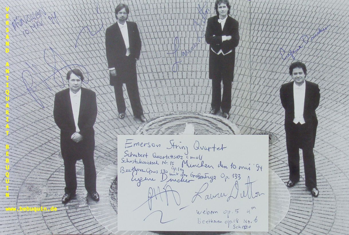 EMERSON STRING QUARTETT.– DRUCKER, Eugene + SETZER, Philip + DUTTON, Lawrence + FINCKEL, David: eigenhändig signierte und datierte Autogrammkarte. München (Herkulessaal), 10.5.1994. 8 x 12,5 cm. Karteikarte in Programmheft. Eintrittskarte anbei. 12 S. mit zahlr. Abb. OKart. leicht gewellt. = Winderstein Konzerte.