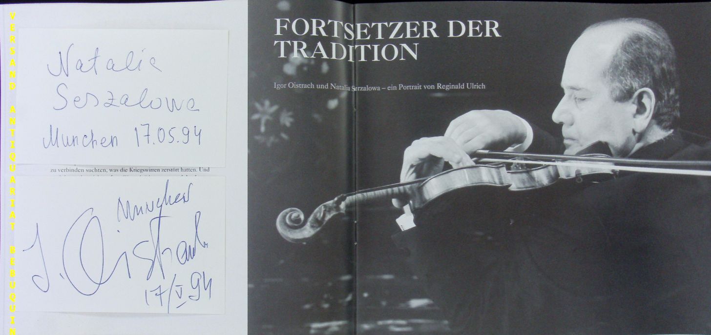 OISTRACH, Igor (Violinist) + SERZALOWA, Natalja (Pianistin): 2 eigenhändig signierte und datierte Autogrammkarte. München (Herkulessaal), 17.5.1994. 8 x 12,5 cm. 2 Karteikarten in Programmheft. Eintrittskarte anbei. 12 S. mit zahlr. Abb. OKart. leicht gewellt. = Winderstein Konzerte. Igor Dawidowitsch Oistrach (* 27. April 1931 in Odessa) ist ein russisch-ukrainischer Geiger. Die russische Pianistin Natalja Serzalowa ist seine Frau. (Wikipedia)