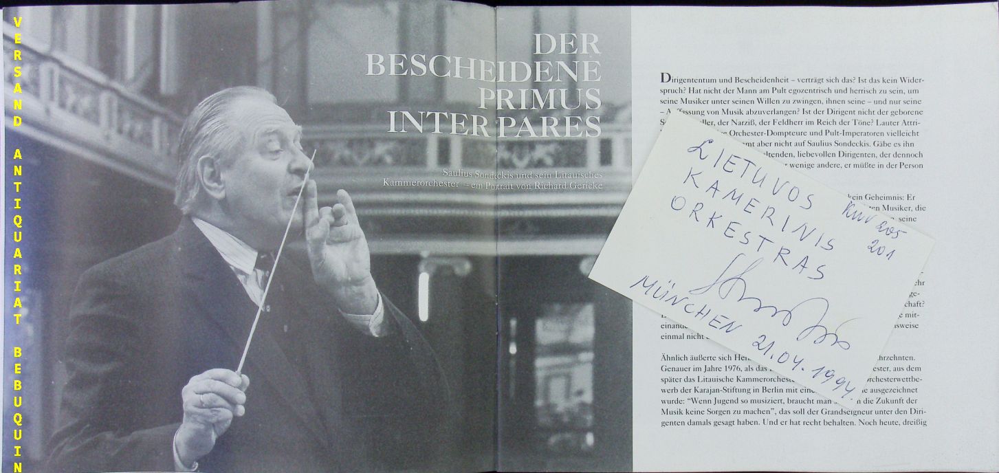 SONDECKIS, Saulius (Dirigent): eigenhändig signierte und datierte Autogrammkarte. München (Philharmonie), 21.4.1994. 8 x 12,5 cm. Karteikarte in Programmheft. 12 S. mit zahlr. Abb. OKart. leicht gewellt. = Winderstein Konzerte. Saulius Sondeckis (* 11. Oktober 1928 in Šiauliai; † 3. Februar 2016) war ein litauischer Dirigent und Professor. (Wikipedia)