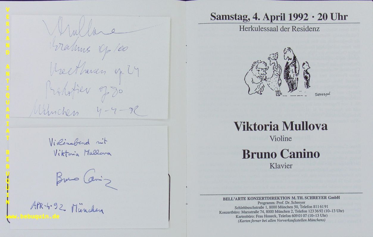 MULLOVA, Viktoria (Violinistin) + CANINO, Bruno (Pianist): 2 eigenhändig signierte und datierte Autogrammkarten. München (Herkulessaal), 4.4.1992. 8 x 12,5 cm. 2 Karteikarte in Programmheft. 4 S. mit zahlr. Abb. ill. OKart. von Sempé. = Bell-Arte Meisterinterpreten. Viktoria Yurievna Mullova (* 27. November 1959 in Schukowski, Oblast Moskau) ist eine der bedeutenden Violinistinnen der Gegenwart. Bruno Canino (* 30. Dezember 1935 in Neapel) ist ein italienischer Pianist und Komponist. (Wikipedia)