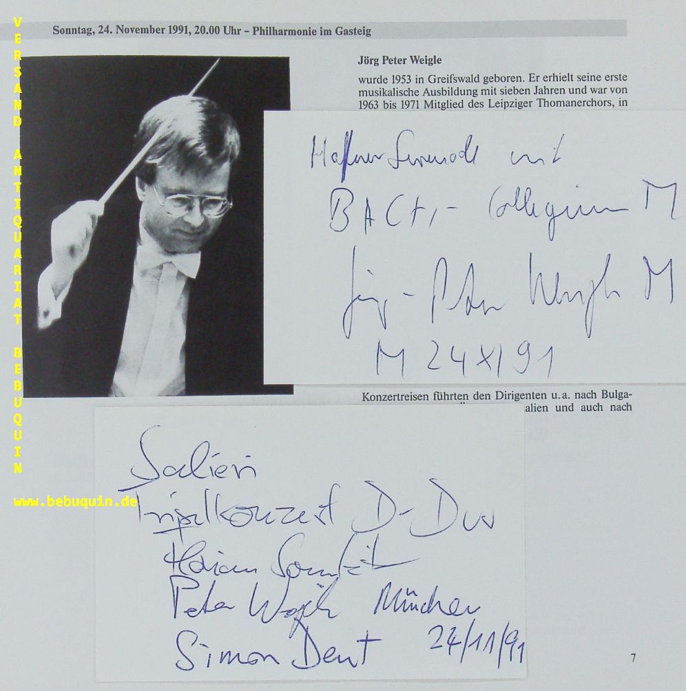 WEIGLE, Jörg Peter (Dirigent) + DENT, Simon (Oboist) + SONNLEITNER, Florian (Violinist) + WÖPKE, Peter (Cellist): 2 eigenhändig signierte und datierte Autogrammkarten. (Musiker + Dirigent) München (Herkulessaal), 24.11.1991. 8 x 12,5 cm. 2 Karteikarte in Programmheft. 16 S. mit zahlr. Abb. ill. OKart. 2 Eintrittskarten anbei. = Münchener Mozart Konzerte. Jörg-Peter Weigle (* 28. März 1953 in Greifswald) ist ein deutscher Dirigent und Chorleiter. Er ist seit dem 1. September 2018 Chefdirigent des Brandenburgischen Staatsorchesters Frankfurt (Oder). (Wikipedia)
