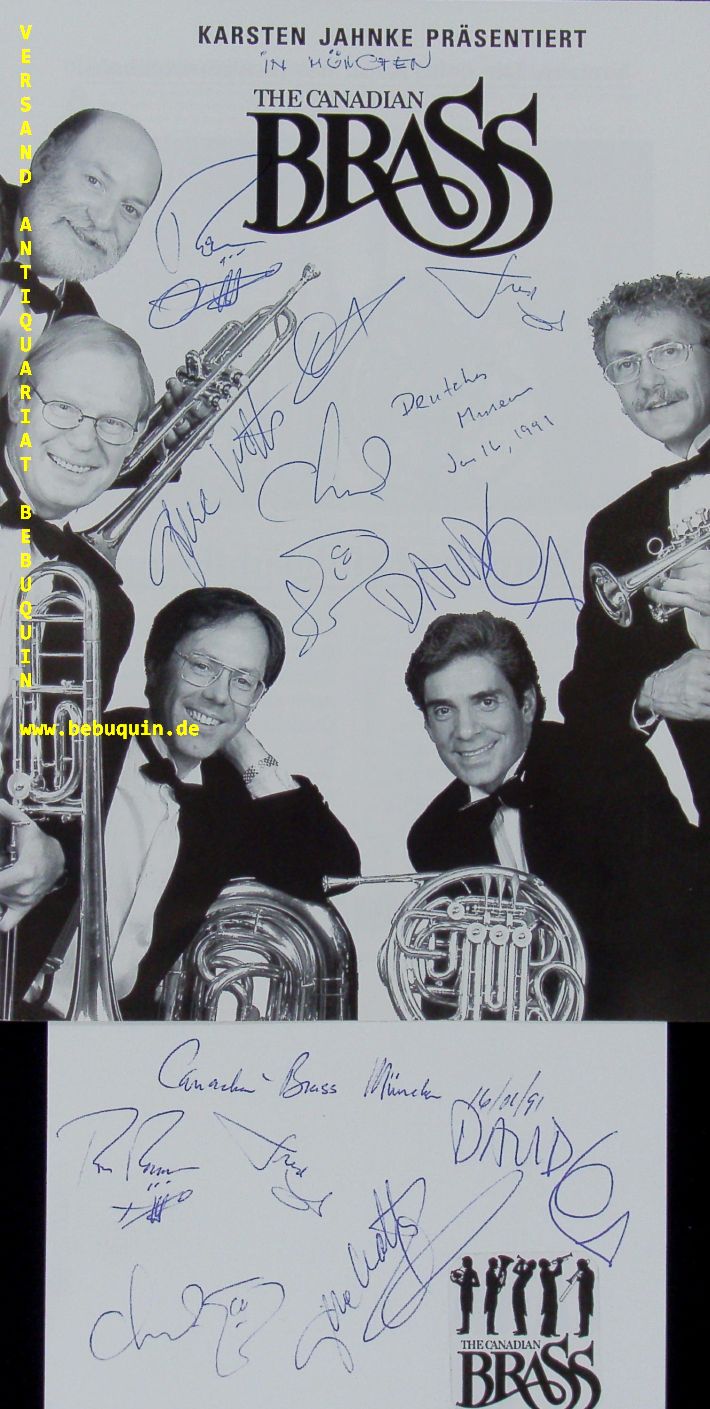 THE CANADIAN BRASS: eigenhändig signierte und datierte Autogrammkarte. (Besetzung: Chuck Daellenbach, Eugene Watts, Ronald Romm, Fred Mills, David Ohanian.) Eröffnungskonzert der Tournee. München, 16.1.1991. 8 x 12,5 Karteikarten in Programmheft. Dieses ebenfalls sehr ansehnlich von den Musikern eigenhändig signiert und datiert. ill. OKart. = Karsten Jahnke. Canadian Brass ist ein Blechbläserquintett in Toronto, Kanada. (Wikipedia)