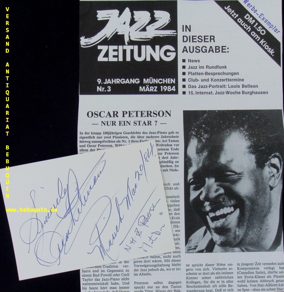 JAZZ.– PETERSON, Oscar (Pianist): eigenhändig signierte und datierte Autogrammkarten. München, 20.3.1984. 10,5 x 14,5 cm. Karteikarten mit Ausschnitt der Jazz Zeitung. ill. OKart. Oscar Emmanuel Peterson (* 15. August 1925 in Montréal; † 23. Dezember 2007 in Mississauga) war ein kanadischer Jazz-Pianist und -Komponist. Duke Ellington nannte ihn den „Maharaja der Tasten“. Er veröffentlichte über 200 Aufnahmen, gewann sieben Grammys und zahlreiche weitere Auszeichnungen in seiner Karriere. Er wird als einer der erfolgreichsten Jazz-Pianisten aller Zeiten angesehen, der in seiner 65-jährigen Karriere auf Tausenden Konzerten spielte. (Wikipedia)