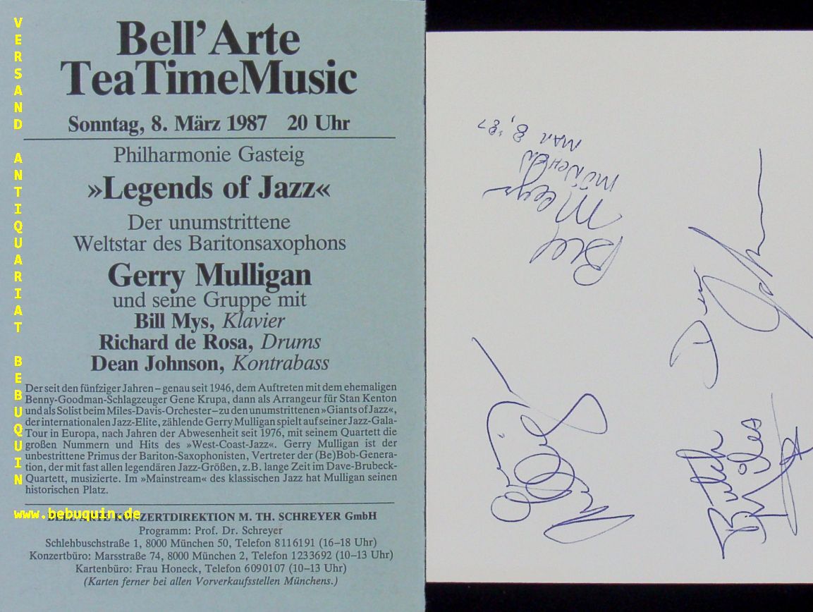 JAZZ.– MULLIGAN, Gerry (Saxophonist) + MAYS, Bill (Pianist) + JOHNSON, Dean (Bassist) + MILES, Butch (Schlagzeuger): eigenhändig von allen signierte und datierte Autogrammkarte. München (Philharmonie), 8.3.1987. 10,5 x 14,5 cm. Karteikarte mit Beiblättern. = Bell’Arte. Gerald Joseph „Gerry“ Mulligan (* 6. April 1927 in Queens, New York City; † 20. Januar 1996 in Darien, Connecticut) war ein US-amerikanischer Jazzmusiker (Baritonsaxophon), Arrangeur und Komponist. Mit seinem klarinettenartigen, in Motivketten elegant perlenden und zugleich leicht anmutenden Spiel hat er dem Baritonsaxophon im Modern Jazz zur solistischen Anerkennung verholfen. Bill Mays (* 5. Februar 1944 in Sacramento, Kalifornien) ist ein US-amerikanischer Jazzpianist. Born in Seattle, Washington, in 1956, Dean studied Bass Violin with a number of bassists, including the renowned Gary Peacock. Dean Johnson also studied piano and composition at the Cornish Institute, in Seattle, with James Knapp and from 1974 to 1976, attended the Berklee College of Music, in Boston, studying with bassists Rich Appleman, John Neves, and studying theory, composition, and arranging with John LaPorta and Herb Pomeroy. Butch Miles (* 4. Juli 1944 in Ironton, Ohio) ist US-amerikanischer Jazz-Schlagzeuger. (Wikipedia)