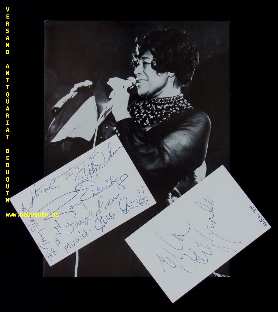 JAZZ.– FITZGERALD, Ella + PASS, Joe (Gittarist) + ELDRIDGE, Roy (Trompeter) + DAVIS, Dddie (Saxophonist)) + DURHAM, Bobby (Schlagzeuger) + FLANAGAN, Tommy (Pianist) + BETTS, Keter (Bassist): 2 eigenhändig signierte und datierte Autogrammkarten (1 x Ella Fitzgerald + 1 x die Band). München (Kongressaal), 13.2.1974. 10,5 x 14,5 cm 2 Karteikarte mit diversen Teilen aus den Programmheften. zahlr. Seiten mit Abb. Ella Jane Fitzgerald (* 25. April 1917 in Newport News, Virginia; † 15. Juni 1996 in Beverly Hills, Kalifornien) war eine US-amerikanische Jazz-Sängerin. Joe Pass, eigentlich Joseph Anthony Passalaqua, (* 13. Januar 1929 in New Brunswick, New Jersey; † 23. Mai 1994 in Los Angeles, Kalifornien) war ein US-amerikanischer Jazz-Gitarrist. Keter Betts, eigentlich William Thomas Betts (* 22. Juli 1928 in Port Chester, New York; † 6. August 2005 in Silver Spring, Maryland) war ein amerikanischer Jazz-Bassist. Thomas „Tommy“ Lee Flanagan (* 16. März 1930 in Detroit; † 16. November 2001 in New York City) war ein amerikanischer Jazz-Pianist des Mainstream Jazz. David Roy „Little Jazz“ Eldridge (* 30. Januar 1911 in Pittsburgh, Pennsylvania; † 26. Februar 1989 in Valley Stream, New York) war einer der bedeutendsten US-amerikanischen Jazztrompeter. Eddie „Lockjaw“ Davis, auch genannt Jaws oder Lock, (* 2. März 1922 in New York als Edward Davis; † 3. November 1986 in Culver City, Kalifornien) war ein US-amerikanischer Jazz-Tenorsaxophonist und Komponist. (Wikipedia)
