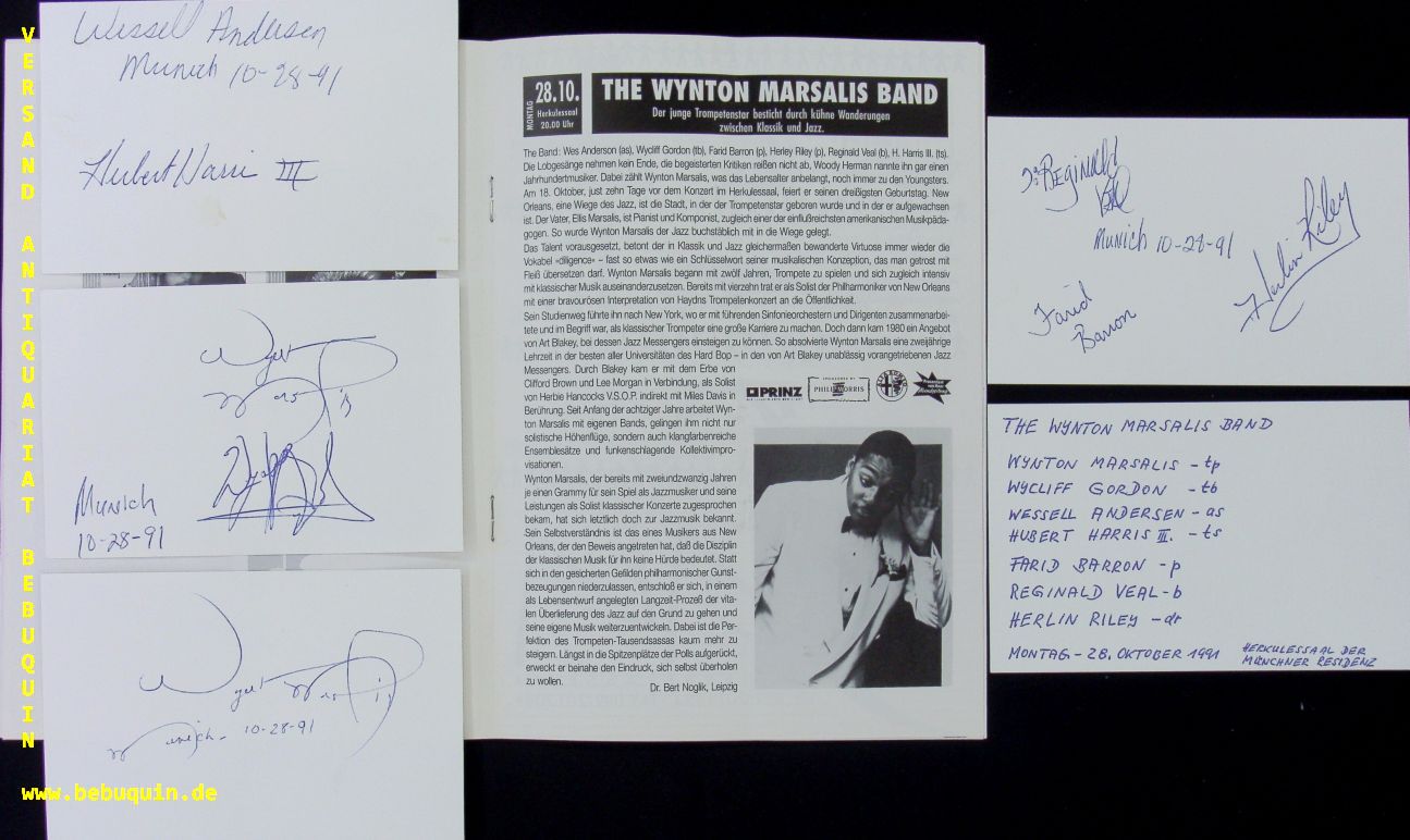 JAZZ.– MARSALIS, Wynton (Trompeter) + GORDON, Wycliff (Posaunist) + ANDERSEN, Wessell ( Saxophonist) + HARRIS, Hubert (Saxophonist) + BARRON, Farid ( Pianist) + VEAL, Reginald ( Bassist) + RILEY, Herlin (Schlagzeuger): 4 eigenhändig datierten und signierte Autogrammkarten. München (Herkulessaal), 28.10.1991. Gr. 8°. 4 Karteikarten in Programmheft der Artonale. 16 S. ill. OKart. = The Wynton Marsalis Band. Wynton Learson Marsalis (* 18. Oktober 1961 in New Orleans) ist einer der bekanntesten Jazztrompeter der Gegenwart und künstlerischer Leiter von Jazz at Lincoln Center. Wycliffe Gordon (* 29. Mai 1967 in Waynesboro, Georgia) ist ein amerikanischer Posaunist, Trompeter, Tubist, Sänger und Didgeridoo-Spieler des Modern Jazz. Farid Barron (* 23. April 1971 in Philadelphia, Pennsylvania) ist ein amerikanischer Jazzpianist. Reginald Veal (* 5. November 1963 in Chicago, Illinois) ist ein amerikanischer Kontrabassist des Modern Jazz. Er spielt „ dramaturgisch hervorragend konstruierte Soli“ und gilt als zuverlässiger Begleiter sowie insgesamt als ein potenzieller „Nachfolger von Ray Brown.“ Herlin Riley (* 15. Februar 1957 in New Orleans) ist ein US-amerikanischer Jazz-Schlagzeuger und Bandleader. (Wikipedia)