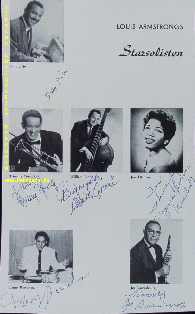 JAZZ.– LOUIS ARMSTRONGS STARSOLISTEN: KYLE, Billy (Pianist) + YOUNG, Trummy ( Posaunist) + CRONK, William (Bassist) + BROWN, Jewel (Sängerin) + BARCELONA, Danny (Schlagzeuger) + DARENBOURG, Joe (Klarinettist): von allen eigenhändig an ihrem Bild auf Großfoto signiert. München, 1962. 29 x 18 cm s/w Zeitschriftausschnitt. William Osborne „Billy“ Kyle (* 14. Juli 1914 in Philadelphia; † 23. Februar 1966 in Youngstown, Ohio) war ein US-amerikanischer Jazz-Pianist des Swing. James Osborne „Trummy“ Young (* 12. Januar 1912 in Savannah, Georgia; † 10. September 1984 in San José, Kalifornien) war ein amerikanischer Jazz-Posaunist, Sänger und Komponist des Swing. William „Bill“ Cronk (auch Billy Cronk, * 28. August 1928; † 29. Mai 2000) war ein US-amerikanischer Jazzmusiker (Kontrabass). Jewel Brown (born August 30, 1937) is an American jazz and blues singer. She is primarily known for her work in the 1950s and 1960s. Before a retirement period she was part of Louis Armstrong’s ensemble. Danny Barcelona (* 23. Juli 1929 in Waipahu, Hawaii; † 1. April 2007 in San Gabriel, Kalifornien) war ein US-amerikanischer Jazz-Schlagzeuger. Er wurde vor allem durch seine Mitgliedschaft in der All-Star-Band von Louis Armstrong bekannt, der er fast 15 Jahre angehörte. Joseph Wilmer „Joe“ Darensbourg (* 9. Juli 1906 in Baton Rouge; † 24. Mai 1985 in Van Nuys, Kalifornien) war ein US-amerikanischer Klarinettist und Saxophonist (Sopran) des Traditional Jazz. (Wikipedia)