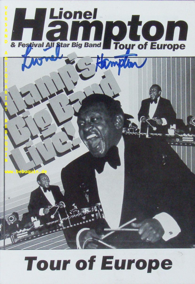 JAZZ.– HAMPTON, Lionel (Vibraphonist): eigenhändig auf dem Umachlag signiertes Programmheft für die Europatour. Kassel (Bärenreiter), 1986. 12 S. mit zahlr. Bildern. ill. OKart. diverse Fotos und andere Prospekte anbei. Lionel „Hamp“ Hampton (* 20. April 1908 in Louisville, Kentucky; † 31. August 2002 in New York) war ein US-amerikanischer Jazzmusiker. Er ist bekannt als Bandleader, Jazzperkussionist und Vibraphonvirtuose. Hampton zählt zu den berühmtesten Namen der Jazzgeschichte und arbeitete mit prominenten Jazzmusikern wie Benny Goodman, Charlie Parker und Quincy Jones zusammen. (Wikipedia)