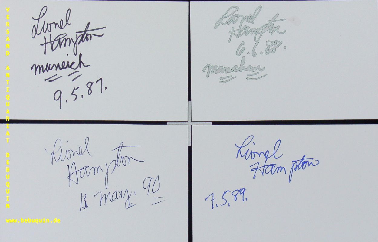 JAZZ.– HAMPTON, Lionel (Vibraphonist): 6 eigenhändig signierte und datierte Autogrammkarten. Münchern (Bärenreiter), 1986-90. 8 x 12,5 cm. 6 Karteikarten. im Einzelnen am 29.5. 1986 + 9.5.1987 + 6.6.1988 + 6.7.1988 + 7.5.1989 + 13.5.1990. zusammen für