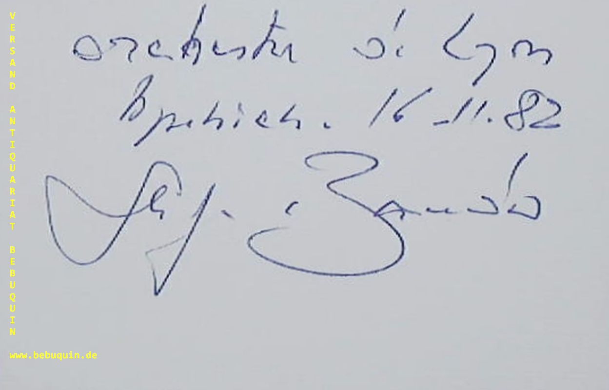 BAUDO, Serge (Dirigent): eigenhändig signierte und datierte Autogrammkarte: Orchestre de Lyon. München (Philharmonie), 16.11.1982. 8 x 12,5 cm. Karteikarte. Serge Baudo (* 16. Juli 1927 in Marseille) ist ein französischer Dirigent. (Wikipedia)