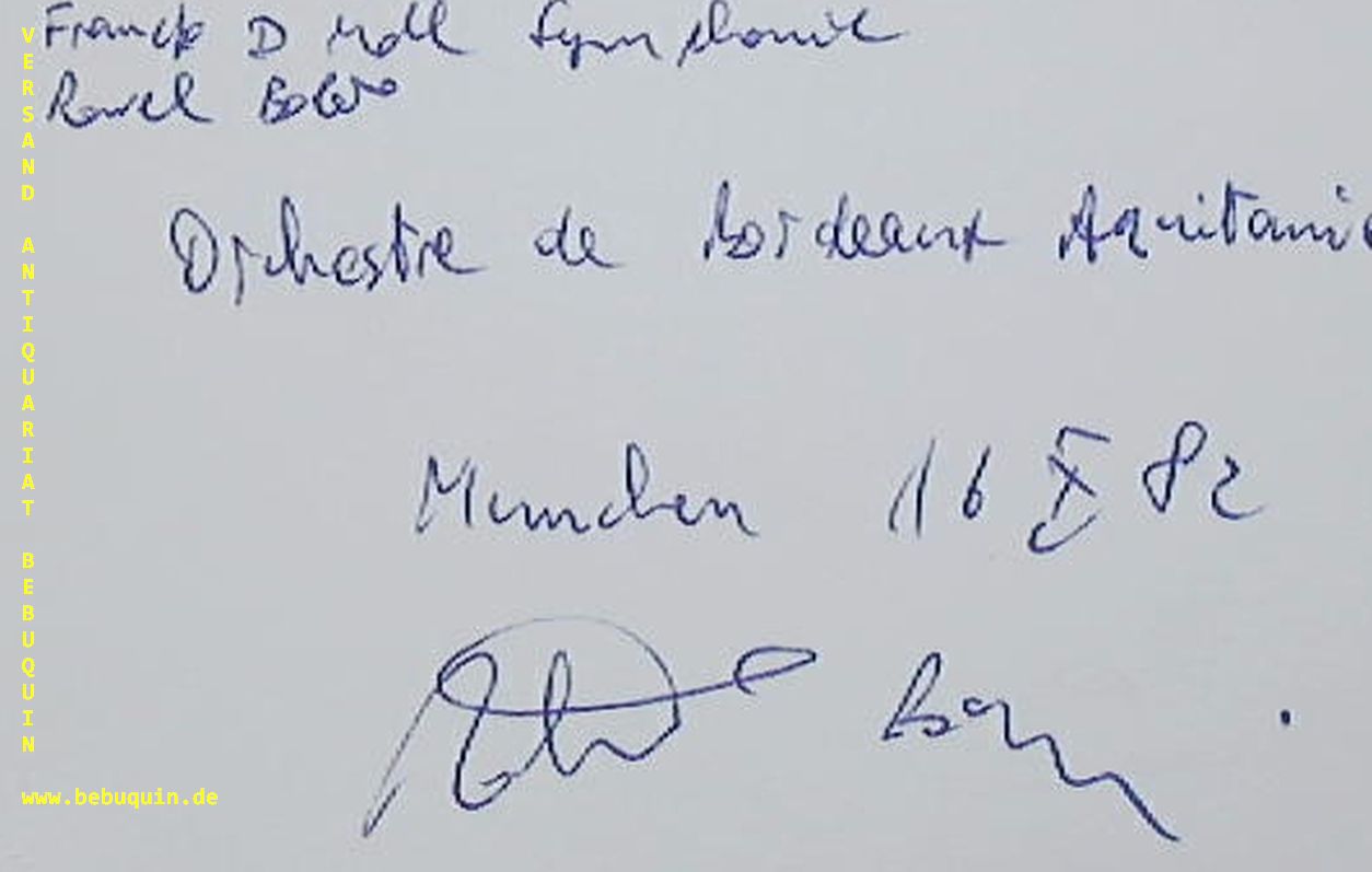 BENZI, Roberto (Dirigent): eigenhändig signierte und datierte Autogrammkarte: Ravel: Bolero. München (Philharmonie), 15.10.1982. 8 x 12,5 cm. Karteikarte. Roberto Benzi (* 12. Dezember 1937 in Marseille) ist ein französisch-italienischer Dirigent. (Wikipedia)