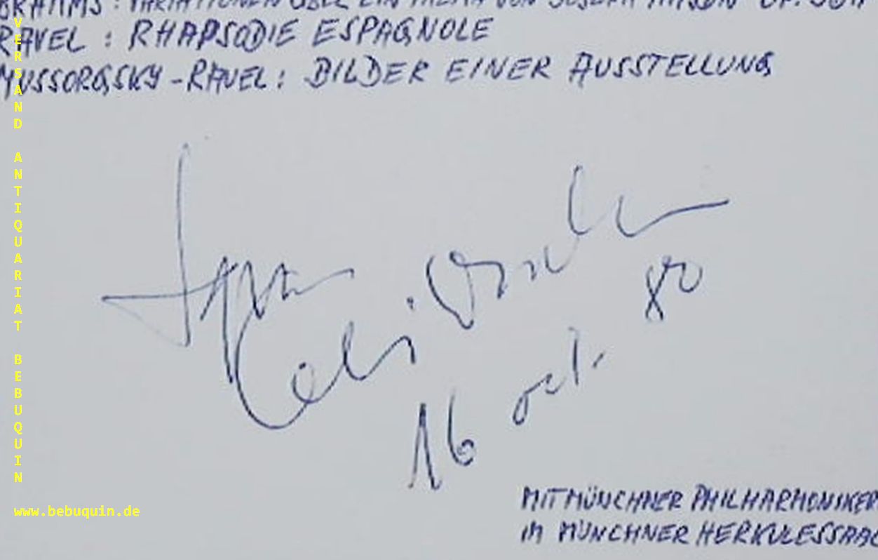 CELIBIDACHE, Sergiu (Dirigent): eigenhändig signierte und datierte Autogrammkarte. Brahms / Ravel / Mussorgsky. München (Herkulessaal), 16.10.1980. 8 x 12,5 cm. Karteikarte. Sergiu Celibidache (* 28. Junijul./ 11. Juli 1912greg. in Roman, Region Moldau, Rumänien; † 14. August 1996 in La Neuville-sur-Essonne bei Paris) war ein rumänischer Dirigent und Musiklehrer, der später die deutsche Staatsbürgerschaft annahm. Anders als Herbert von Karajan lehnte er die Musikvermarktung per Schallplatte oder CD ab und fühlte sich als Antipode zu Karajan. Seine Erklärung für diese Einstellung war philosophisch: Musik sei keine Konserve, die man festhalten könne, sie lebe im Augenblick der Entstehung. Musik sei auch an den speziellen Raum ihrer Aufführung (etwa an einen speziellen Konzertsaal) gebunden, der Reichtum der Musik, der sich nur im Raum entfalten könne, werde durch jegliche Aufnahme und Lautsprecher-Wiedergabe beschnitten. Er lehnte daher Aufnahmen ab, so dass die ersten CDs (Konzertmitschnitte) erst nach seinem Tod veröffentlicht wurden. (Wikipedia)