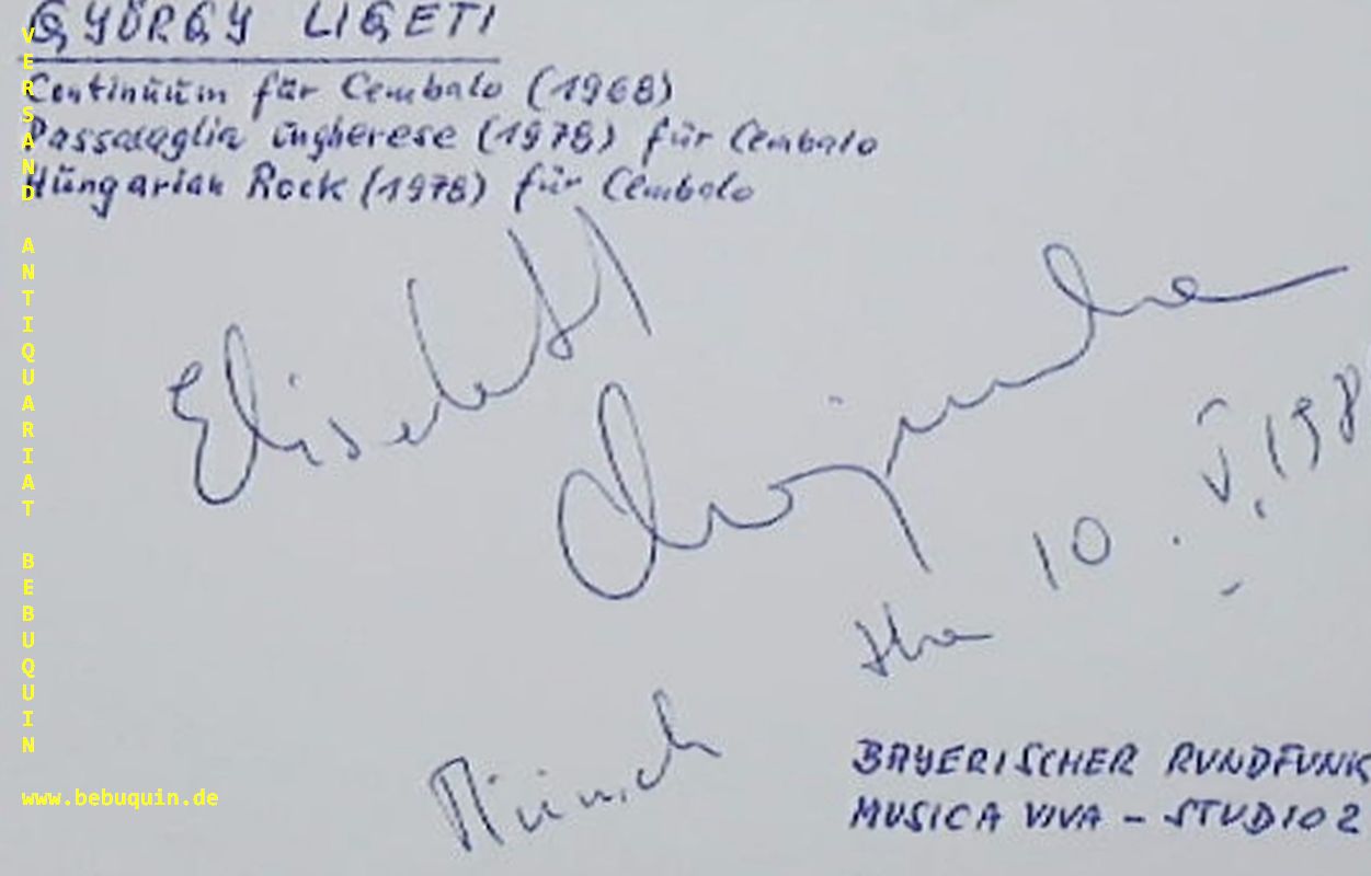 CHOJNACKA, Elisabeth (Cembalistin): eigenhändig signierte und datierte Autogrammkarten. György Ligeti. München (Herkulessaal), 10.5.1981. 8 x 12,5 cm. Karteikarten selten. Elzbieta Chojnacka (* 10. September 1939 in Warschau; † 28. Mai 2017 in Paris) war eine polnische Cembalistin und Musikpädagogin. (Wikipedia)