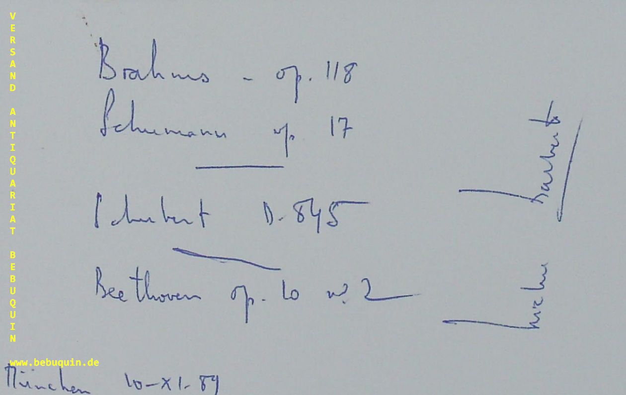 DALBERTO, Michel (Pianist): eigenhändig signierte und datierte Autogrammkarte: Brahms Schumann Schubert Beethoven. München, 10.11.1989. 8 x 12,5 cm. Karteikarte. Michel Dalberto (* 2. Juni 1955 in Paris) ist ein französischer Pianist. (Wikipedia)