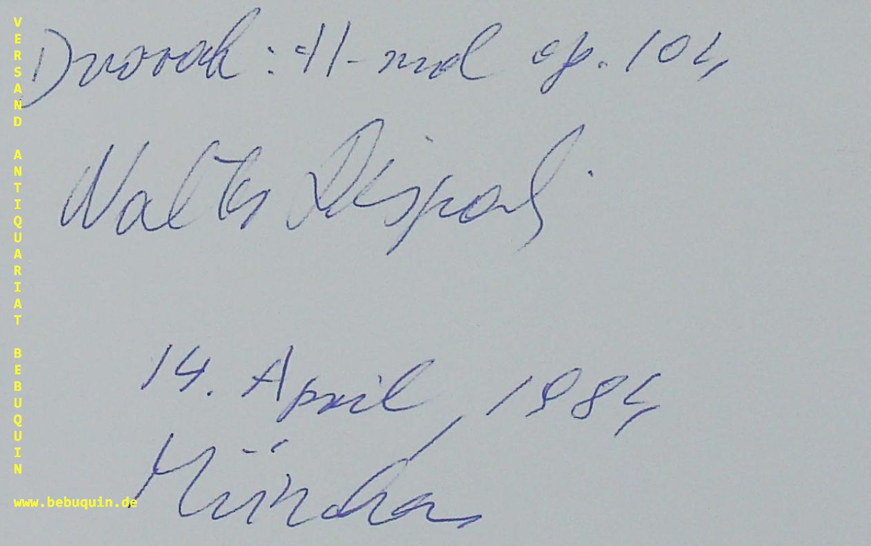 DESPALJ, Walter (Cellist): eigenhändig signierte Autogrammkarten mit ausführlicher eigenhändiger Stückbeschreibung. München (Herkulessaal), 14.4.1984. 8 x 12,5 cm. Karteikarte. Valter Dešpalj (* 1947 in Zadar) ist ein kroatischer Cellist. Er lehrt als Professor an der Musikakademie Zagreb. Er studierte zunächst an der Juilliard School bei Leonard Rose, Felix Galimir und dem Juilliard Quartett, später bei Galina Kosolupowa am Tschaikowski Konservatorium Moskau. Meisterkurse bei P. Casals, P. Fournier und A. Navarra rundeten seine Ausbildung ab. (Wikipedia)