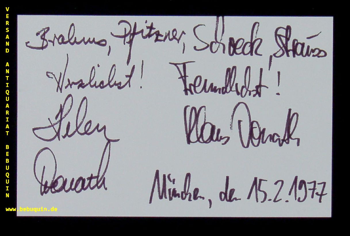 DONATH, Helen (Sopran) + Klaus (Pianist): eigenhändig datierte und von beiden signierte Autogrammkarte: Herzlichst! Freundlichst! München (Philharmonie), 15.2.1977. 8 x 12,5 cm. 1 Karteikarte. Helen Donath, geborene Helen Erwin, (* 10. Juli 1940 in Corpus Christi, Texas) ist eine US-amerikanische Opernsängerin (Sopran).(Wikipedia)