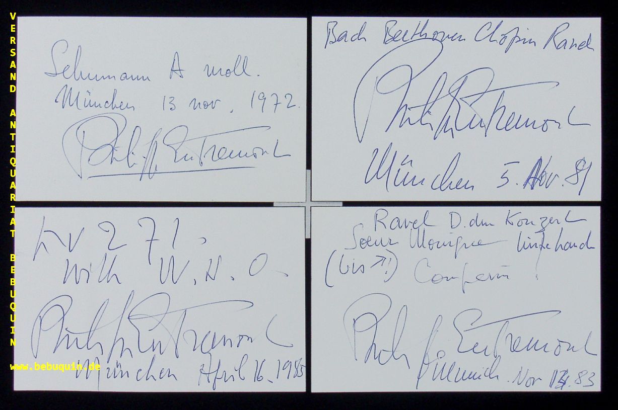 ENTREMONT, Philippe (Pianist): 5 eigenhändig signierte und datierte Autogrammkarten mit eigenhändigen Programmbeschreibungen. München (Herkulessaal), 1972 – 1985. 8 x 12,5 cm. 5 Karteikarten. Philippe Henri Jean Émile Léon Entremont (* 7. Juni 1934 in Reims) ist ein französischer Pianist, Dirigent und Musikpädagoge. (Wikipedia)