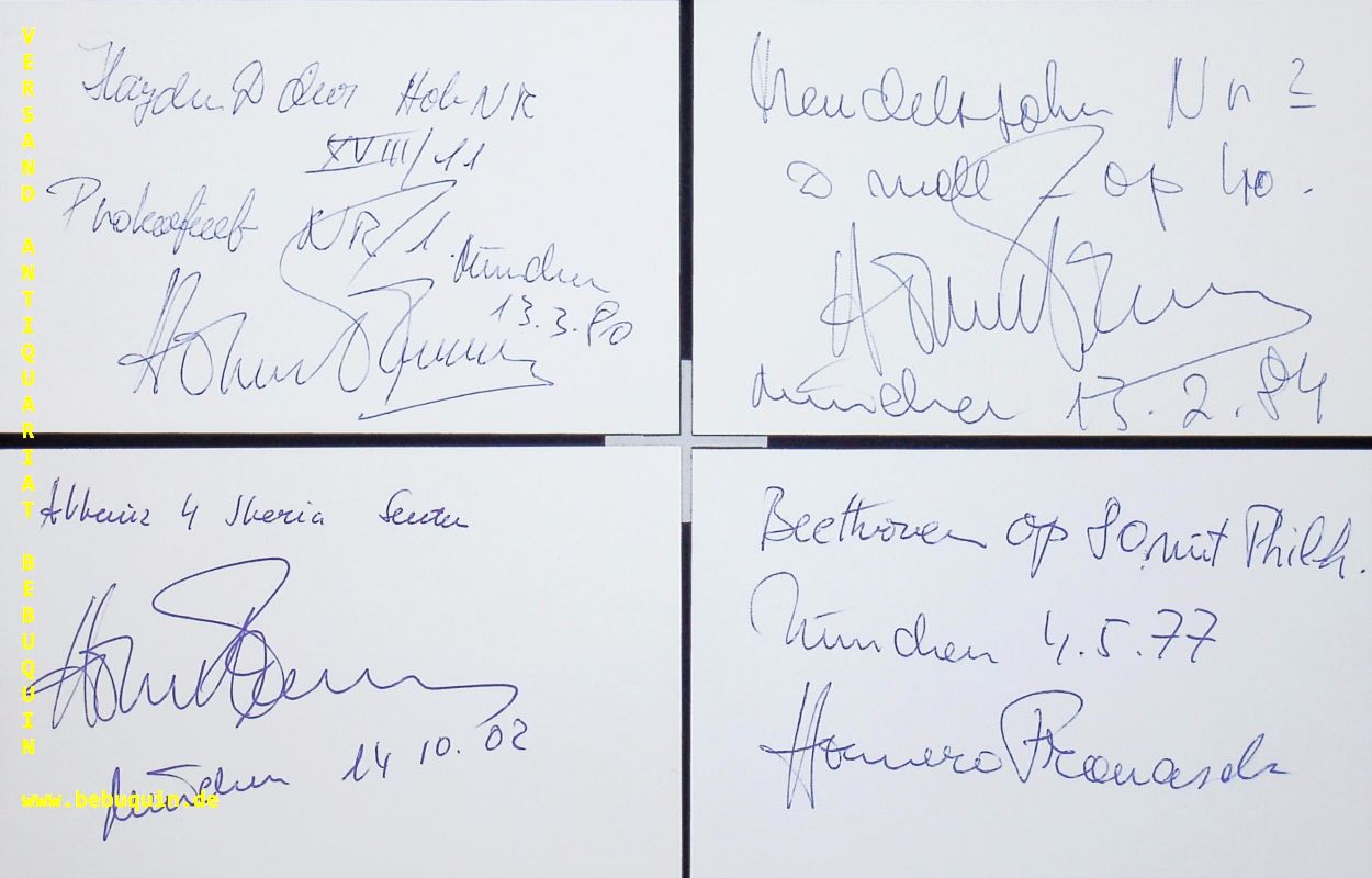 FRANCESCH, Homero (Pianist): 4 eigenhändig signierte und datierte Autogrammkarten. München (Philharmonie), 1977 – 2002. 8 x 12,5 cm. 4 Karteikarten. Homero Francesch (* 6. Dezember 1947 in Montevideo) ist ein uruguayisch-schweizerischer Pianist. (Wikipedia)