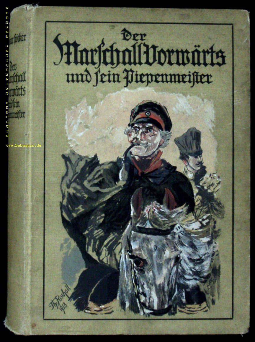 HÖCKER, Oskar: Der Marschall Vorwärts und sein getreuer Piepenmeister. Historische Erzählung aus der zeit der deutschen Befreiungskriege. 7. Aufl. Leipzig (Spamer), nach 1910. Gr. 8°. 350 (2) S. mit 8 Farbendruckbildern bach Aquarellen von R. Knötel. ill. OLn. etwas schief gelesebn. Klotz 2729/113.