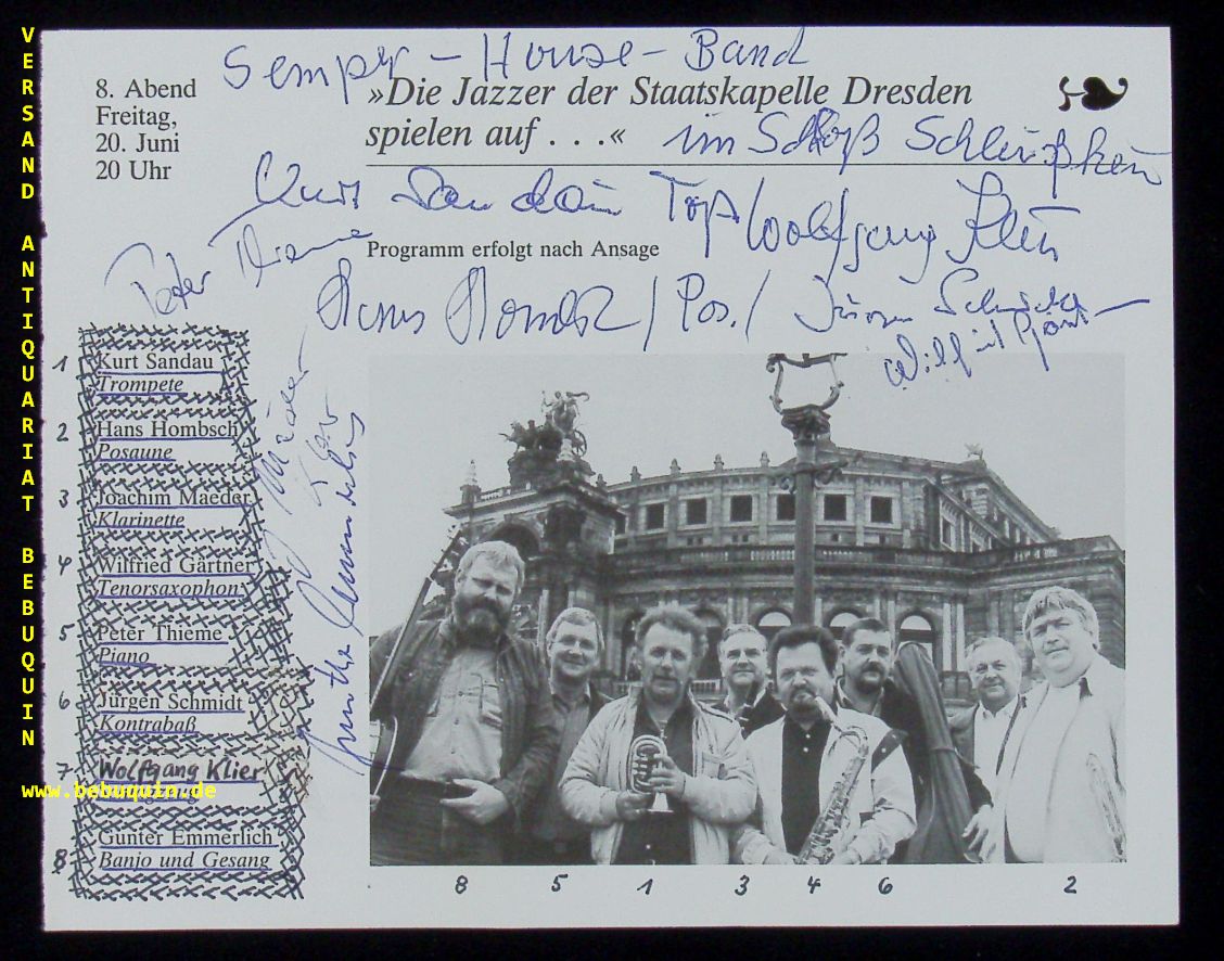 JAZZ.– SEMPER HOUSE BAND: Blatt mit den eigenhändigen Signaturen der Jazzer der Staatskapelle Dresden Kurt Sandau, Hans Hombsch, Joachim Maeder, Wlfried Gärtner, Peter Thieme, Jürgen Schmidt, Wolffgang Klier, Gunter Emmerlich. München, o.J. Gr. 8°. Programmausschnitt .