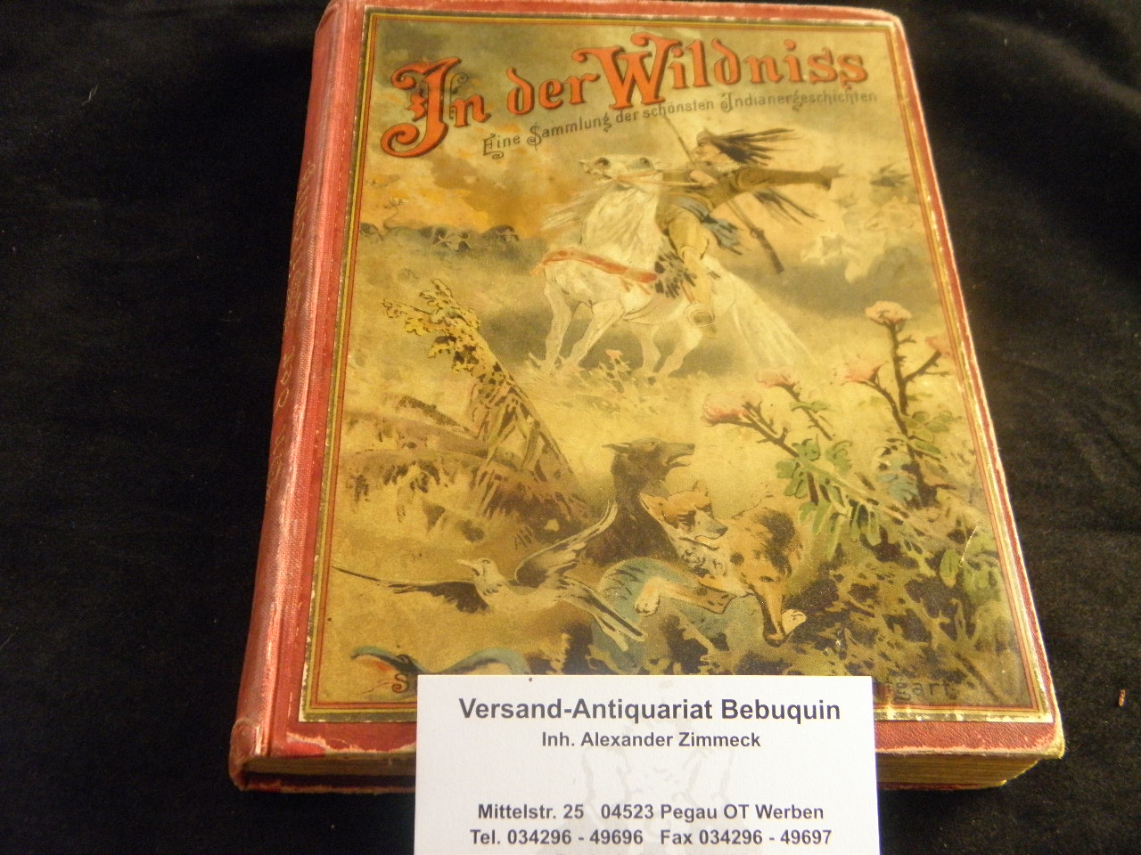INDIANER.– MYLIUS, Oscar: (d.i. Scipio) In der Wildnis. Eine Sammlung der schönsten Indianergeschichten. Stuttgart (Süddeutsches), (1899). Gr. 8°. III, 162 (2) S. mit zahlr. Textabb. + 8 Vollbildern in Holzschnitt und 3 Farbendruckbildern von G. Franz, W. Zweigle u.a. OHLn mit mont. Farbbild. Kanten betrieben, etwas fingerspurig. seltene Ausgabe. Klotz 4873/112.