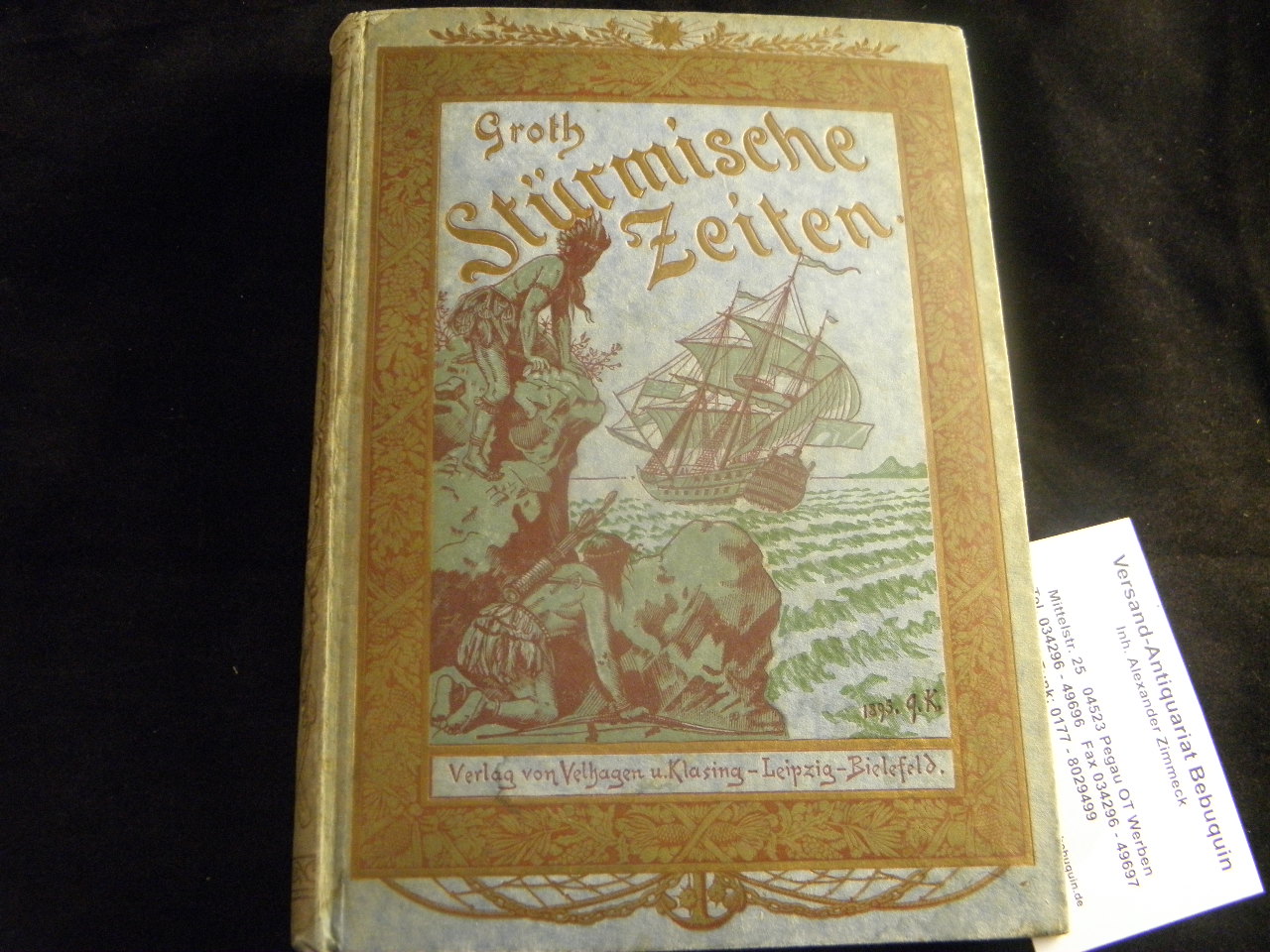 GROTH, Ernst Johann: Stürmische Zeiten. Abenteuer und Kriegserlenisse eines jungen Seemanns unter Admiral Drake. Bielefeld (V&K), (1896). Gr. 8°. VII, 499 S. mit 15 Vollbildern von Georg Koch und 2 farb. Karten. farb. ill. OPb. Vorsätze erneuert, gutes Ex. EA. Klotz 2120/1.