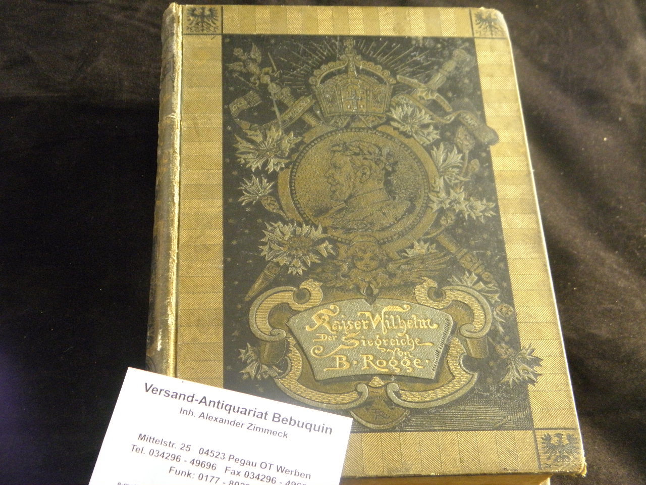 ROGGE, Bernhard: Kaiser Wilhelm der Siegreiche. Sin Leben und seine Thaten für das Volk und die Jugend dargestellt. 2. Aufl. Bielefeld (V&K), 1890. Gr. 8°. V, 479 S. mit 125 Abb. OLn mit reicher Goldprägung und Verzierung. Kanten und Ecken berieben und bestoißen, sonst gut erhalten. nicht bei Klotz.