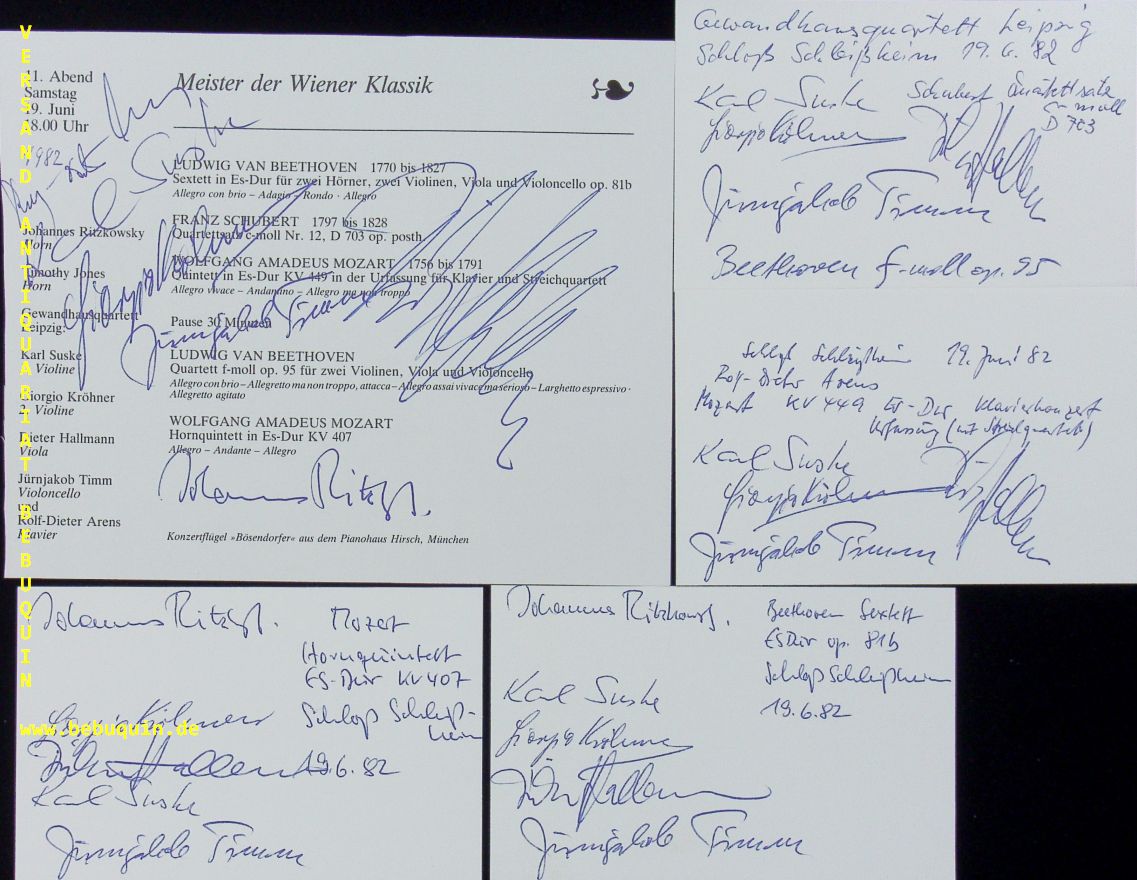 RITZKOWSKY, Johannes (Hornist) + JONES, Timothy ( Hornist) + SUSKE, Karl (Violonist) + KRÖHNER, Giorgio (Violinist) + HALLMANN, Dieter (Viola) +TIMM, Jürnjakob (Cellist) + ARENS, Rolf-Dieter (Pianist): eigenhändig von allen signierter Programmausschitt. München, 19.6.1982. 15 x 18 cm. 1 Blatt aus Programmheft + 4 von allen Mitgliedern des Gewandhausquartetts eigenhändig signierte Karteikarten. Johannes Ritzkowsky (* 24. Juni 1946 in Eschwege) ist ein deutscher Hornist und Dozent an einer Musikhochschule. (Wikipedia)