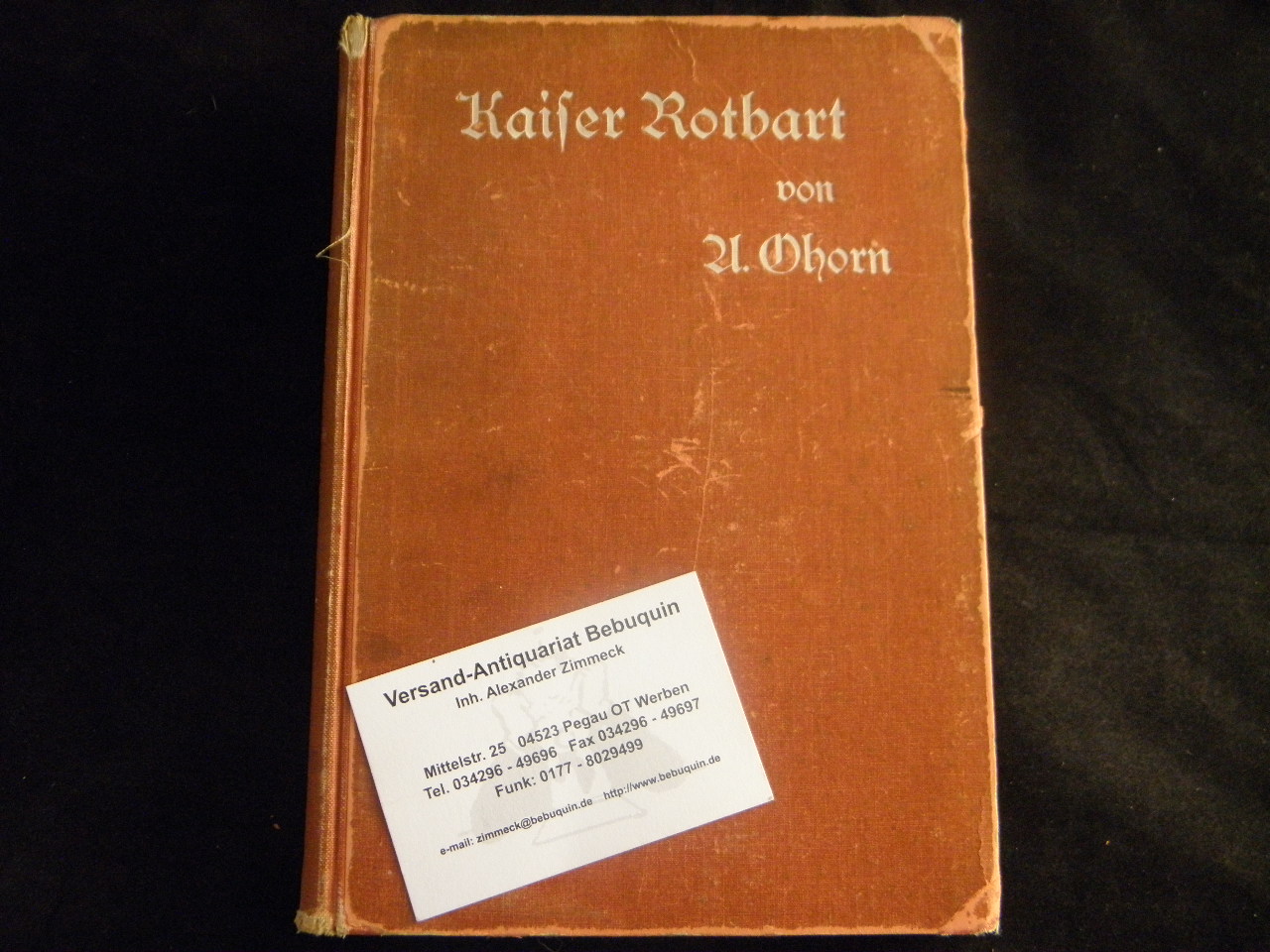 OHORN, Anton: Kaiser Rotbart. Eine Erzählung aus der Zeit der Hohenstaufen. München (Lehmann), (1900). Gr. 8°. 302, 16 S. mit zahlr. Abb. von Maler A. Hoffmann und bildreicher Verlagspräsentation. OHLn. Kanten berieben, NaV, leicht angeplatzt. seltene EA. Klotz 5167/17.