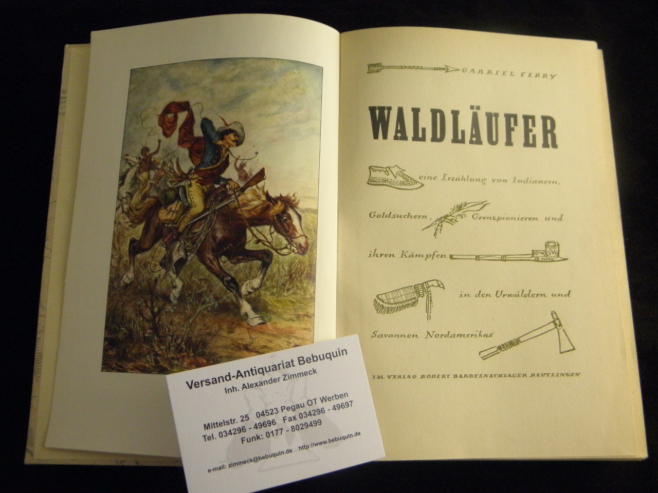 FERRY, Gabriel: Der Waldläufer. Eine Erzählung von Indianern, Goldsuchern, Grenzpionieren und ihren Kämpfen in den Urwäldern und Savannen Nordamerikas. Hrsg. von Friedrich Holz. Reutlingen (Bartenschlager), 1953. Gr. 8°. 224 S. mit 6 Farbtafeln. ill. OHLn. gute Erhaltung. 1. Aufl. dieser Ausgabe. Klotz 1451/24.