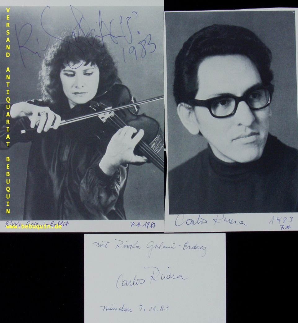 GOLANI – ERDESZ, Rivka (Viola):: eigenhändig signiertes und datiertes Portrait aus Programmheft. München (Herkulessaal), 7.11.1983. 21 x 15 cm. 1 Bl. + 1 signiertes Portrait von Carlos Rivera aus Programheft sowie 1 signierte und datierte Karteikare von demselben. Rivka Golani (born 22 March 1946) is an Israeli viola player. She has performed as soloist with many orchestras throughout the world including the Boston Symphony, Calgary Philharmonic, Royal Concertgebouw, BBC Symphony, BBC Philharmonic, Hong Kong Symphony, Singapore Symphony, Royal Philharmonic, Rotterdam Philharmonic, Israel Philharmonic, Tokyo Metropolitan, Montreal Symphony and the Toronto Symphony. More than 250 pieces have been written for her, including over 60 concertos. The BBC Music Magazine included her in its list of the 200 most important instrumentalists and the five most important violists currently concertizing. (Wikipedia)
