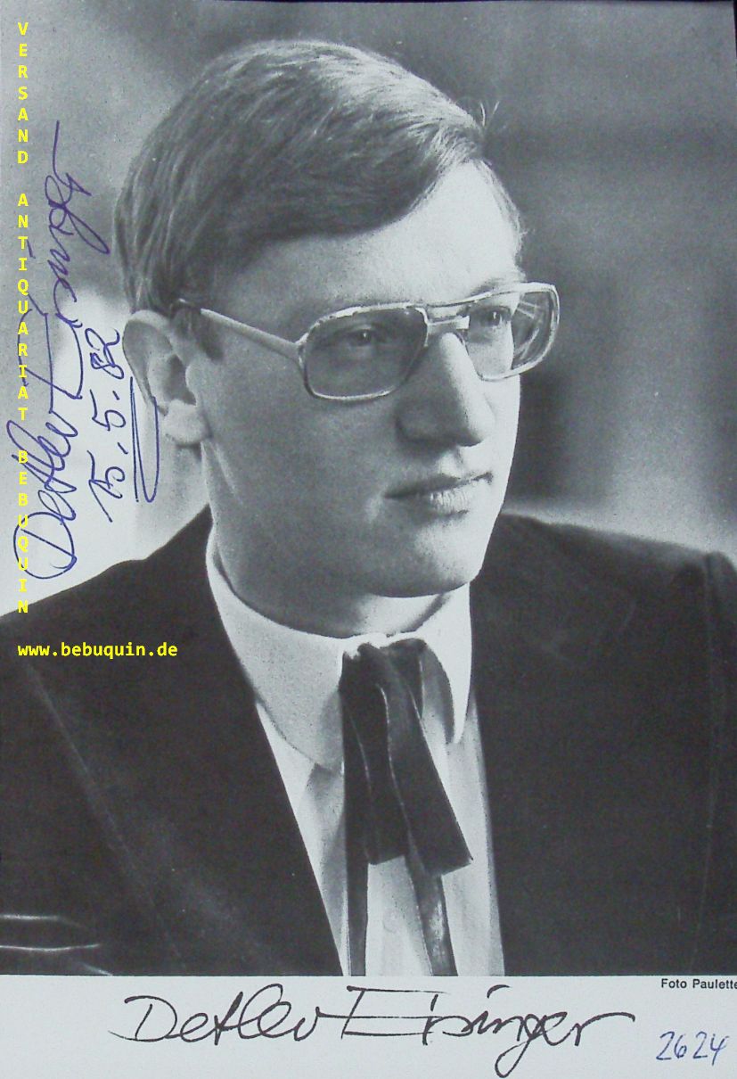 EISINGER, Detlev (Pianist): eigenhändig signiertes und datiertes Portrait aus Programmheft. München (Herkulessaal), 15.5. 1982. 20,5 x 14 cm. 1 Bl. Foto von Paulette. Detlev Eisinger (* 26. November 1957 in München) ist ein deutscher Pianist. (Wikipedia)
