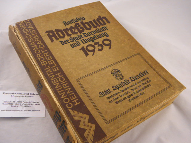 DARMSTADT.– AMTLICHES ADRESSBUCH DER STADT DARMSTADT UND UMGEBUNG 1939.– Mit den Einwohnerverzeichnissen von Darmstadt-Arheiligen, – Eberstadt, Griesheim, Jugenheim, Nieder-Ramstadt, Ober-Ramstadt, Pfungstadt, Roßdorf, Seeheim und Traisa. Darmstadt (Roether), 1938. Gr. 4°. 6 Bl., 100, 578, 78 S. mit zahlr. Abb. ill. OPb. alter Rücken neu aufgezogen, Rückdeckel innen randgebräunt, insgesamt gutes Ex. Seltenes Adressbuch mit der Sortierung nach Einwohner, Straßen, Branchen und Behörden.