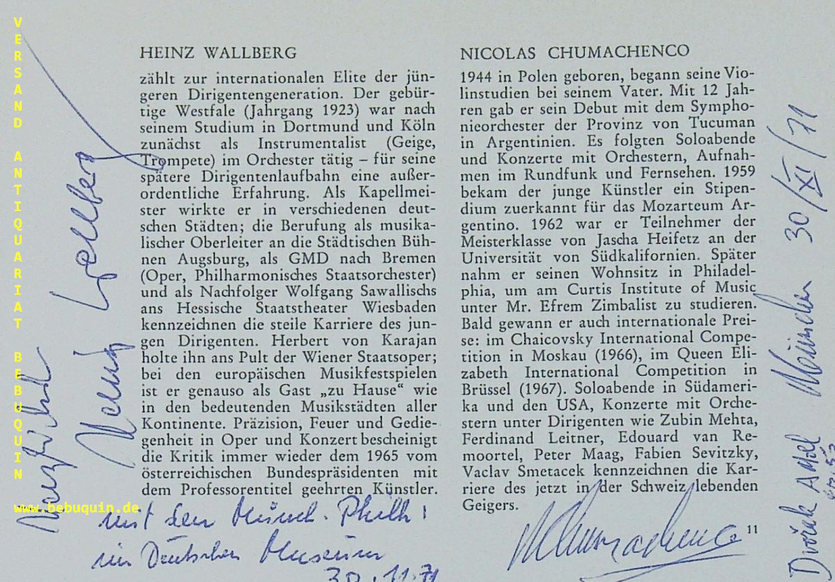 WALLBERG, Heinz (Dirigent) + CHUMACHENCO, Nicolas (Violinist): 2 eigenhändige Signaturen auf Programmheft. München, 30.11.1991. Quer kl 8°. 1 Bl. Heinz Wallberg (* 16. März 1923 in Herringen (heute Hamm); † 29. September 2004 in Essen) war ein deutscher Dirigent. Nicolas Chumachenco or Chumachenko (March 27, 1944 – December 12, 2020) was a Polish-born violin soloist, professor, and director of the Queen Sofía Chamber Orchestra. (Wikipedia)