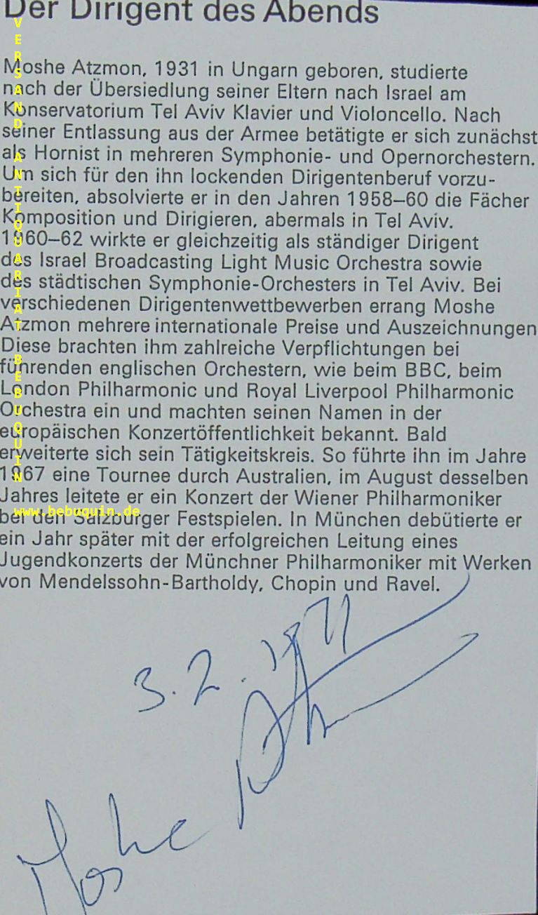 ATZMON, Moshe (Dirigent): eigenhändig signierter und datierter Ausschnitt aus Programmheft. Leipzig, 3.2.1971. 14,5 x 8,5 cm. 1 Bl. Moshe Atzmon (* 30. Juli 1931 in Budapest; ursprünglich Móse Grószberger) ist ein israelischer Dirigent. (Wikipedia)