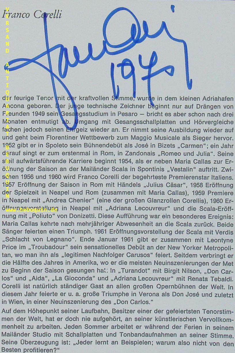 CORELLI, Franco (Tenor): eigenhändig signiertes und datiertes Zeitschriftenausschnitt. München, 13.12.1970. 18,5 x 12,5 cm. 1 Bl. leicht angeschmutzt. Franco Corelli (* 8. April 1921 als Dario Franco Corelli in Ancona; † 29. Oktober 2003 in Mailand) war ein italienischer Opernsänger, Spinto-Tenor und dramatischer Tenor des italienischen und französischen Opernrepertoires des 19. und 20. Jahrhunderts. Bekannt wurde Corelli mit Partien von Verdi, Puccini,[3] Giordano, Leoncavallo, Ciléa, Bizet und Gounod. (Wikipedia)